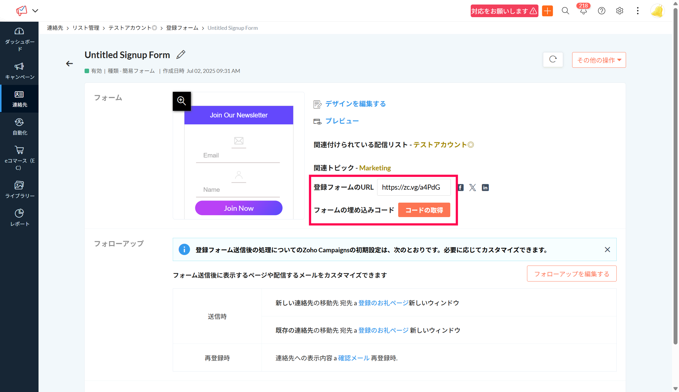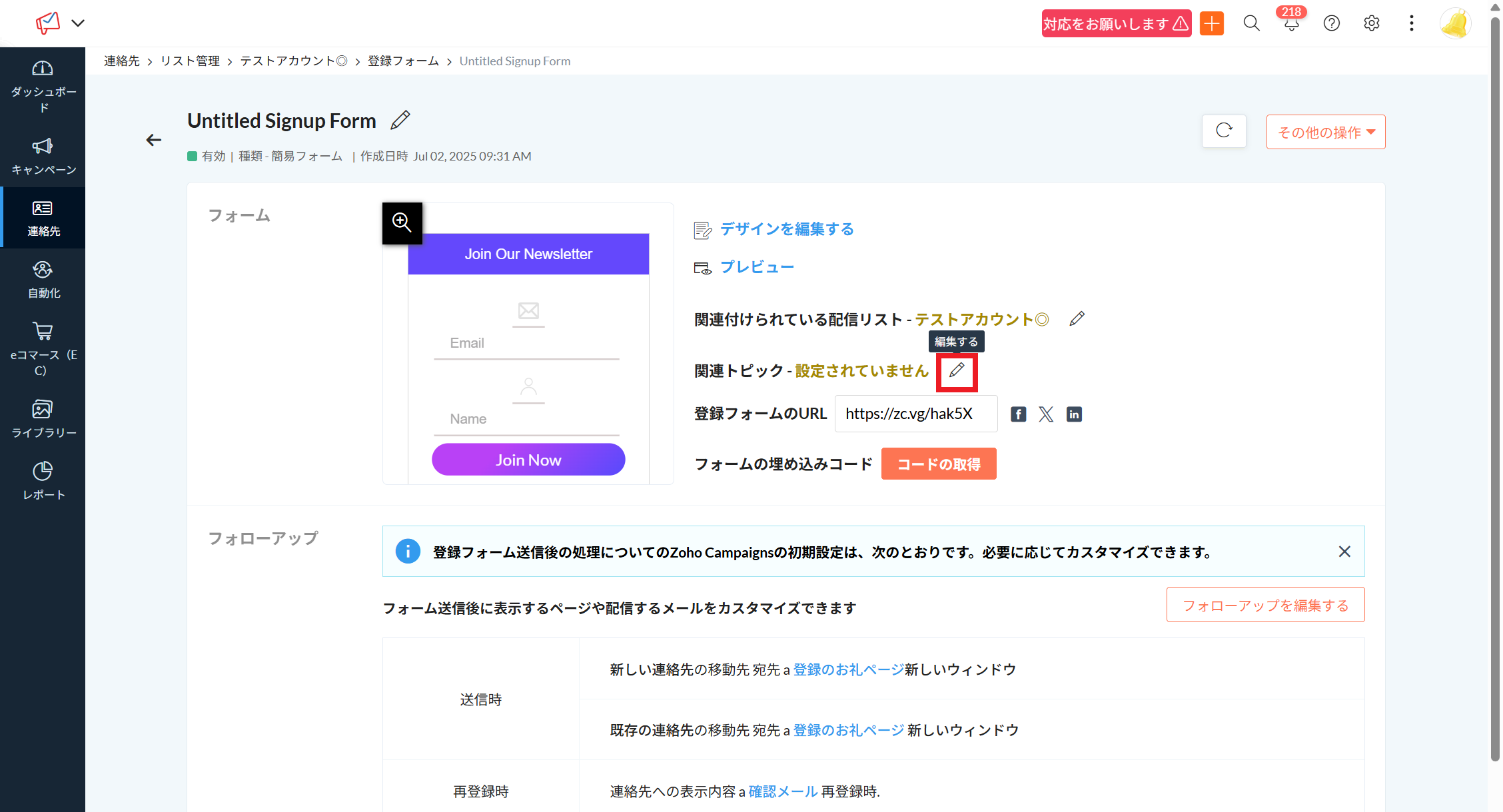連絡先がリストに関連付けられていても、トピックが関連付けられていない場合には、その連絡先に対してキャンペーンが送信されないため、トピックは必ず登録フォームに関連付けるようにしましょう。