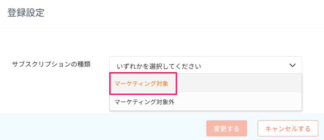 登録設定ポップアップで、サブスクリプションの種類を「マーケティング対象」に設定し、「変更する」をクリックします。