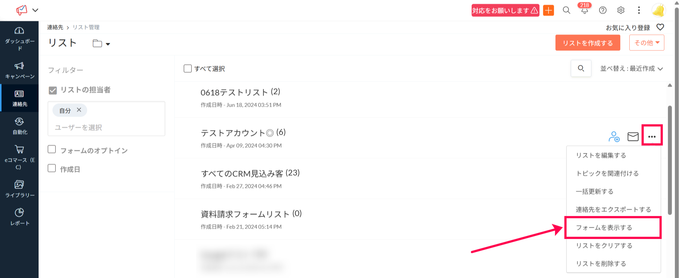 連絡先 >リスト管理に移動し、登録フォームを作成したいリスト右にある・・・より「フォームを表示する」をクリックします。
