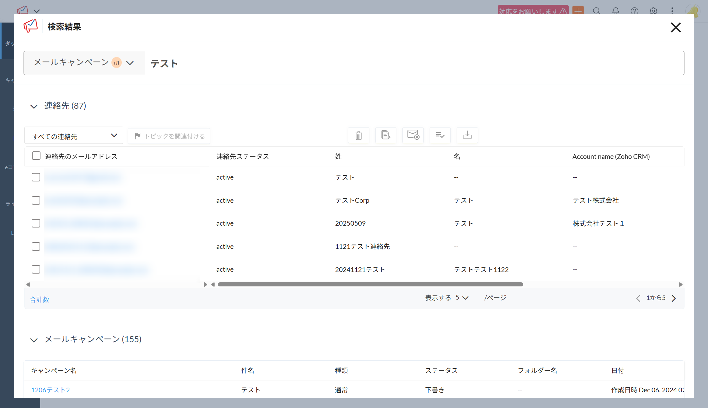 初期設定では、Zoho Campaigns内すべてを検索する「すべて」のチェックボックスにチェックが入っているので、必要に応じて、チェックを外します。