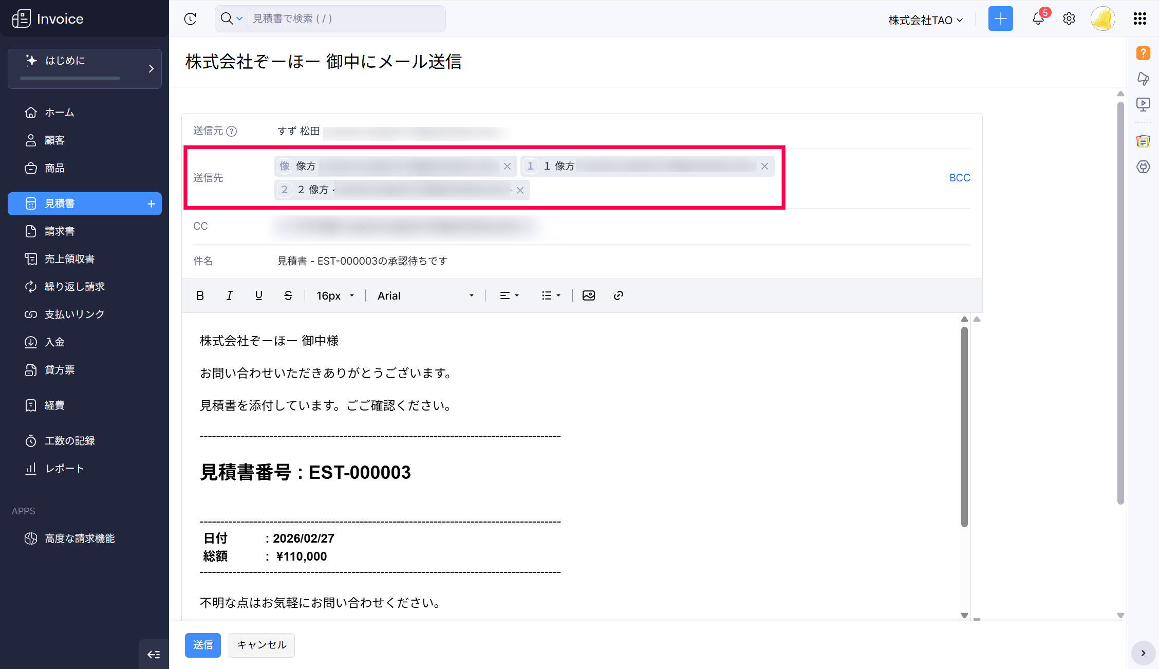【Zoho Invoice】見積書を複数の担当者に送信する方法