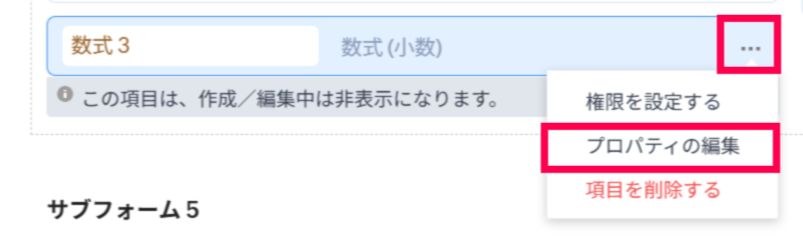 該当の数式項目右に表示される「・・・」から「プロパティの編集」をクリックします。