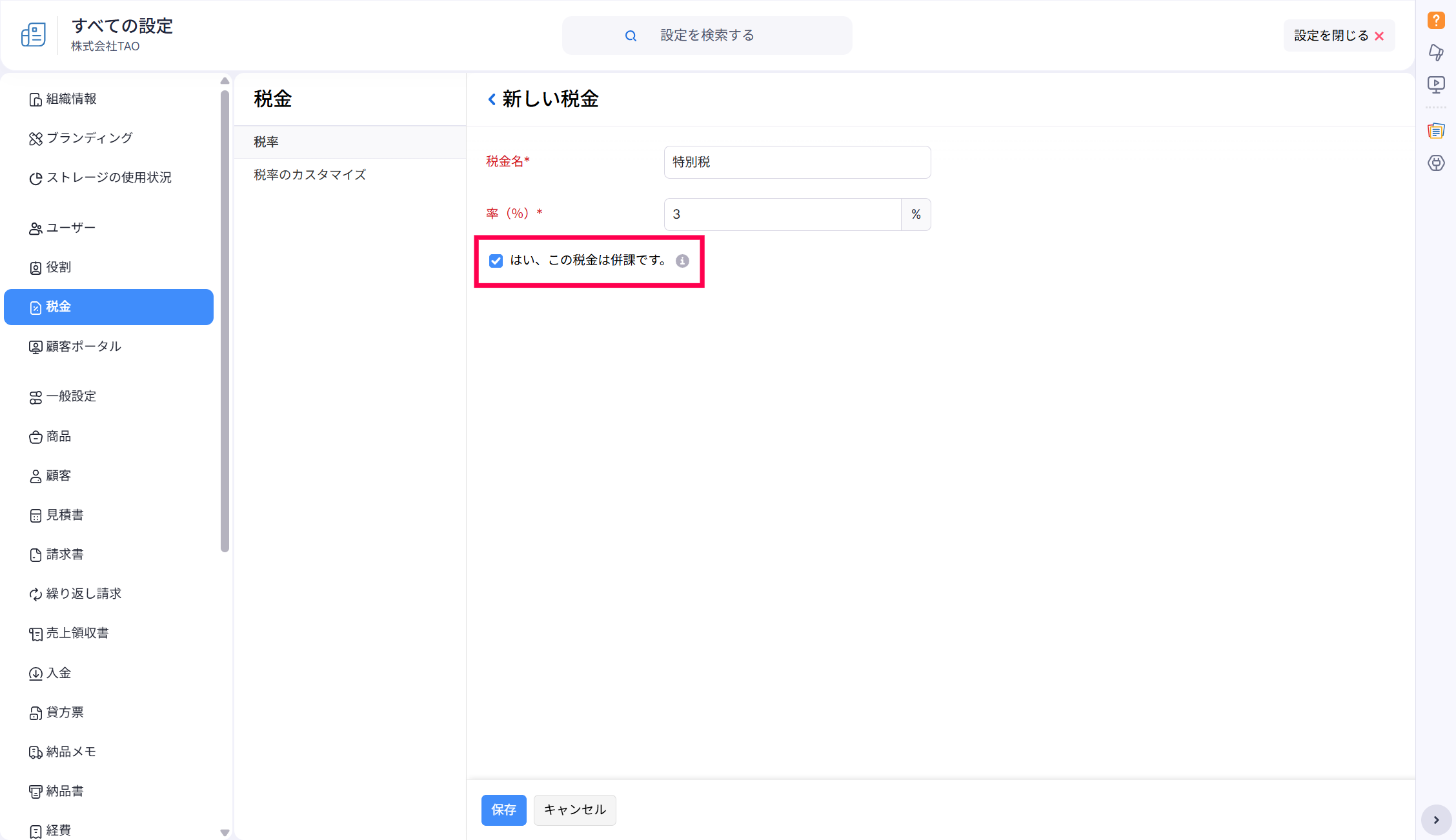 - 「税金名」と「税率」を設定、「はい、この税金は併課です。」オプションを有効化して、「保存」ボタンをクリックします。