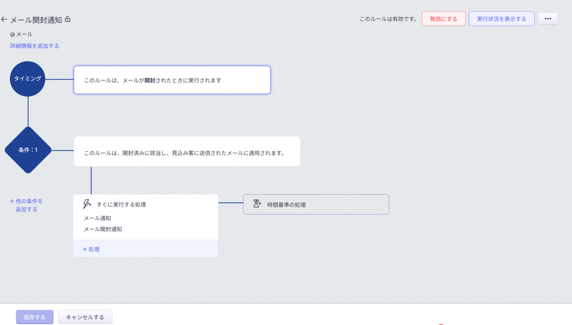 2.実行するタイミングを「送信メール 次の値と等しい 開封済み」に設定