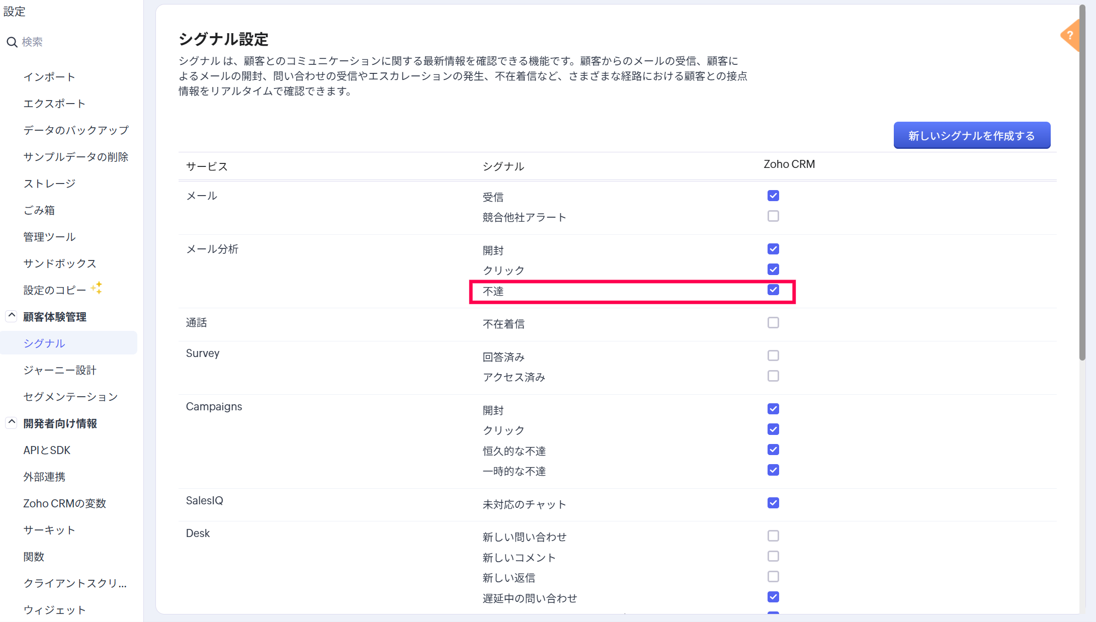 「メールの分析」機能を有効化後、設定>顧客体験管理>シグナル画面へ移動し、メール分析セクションの「不達」にチェックを入れます。