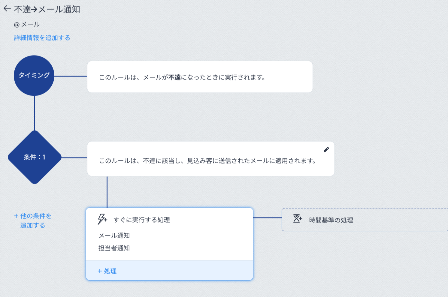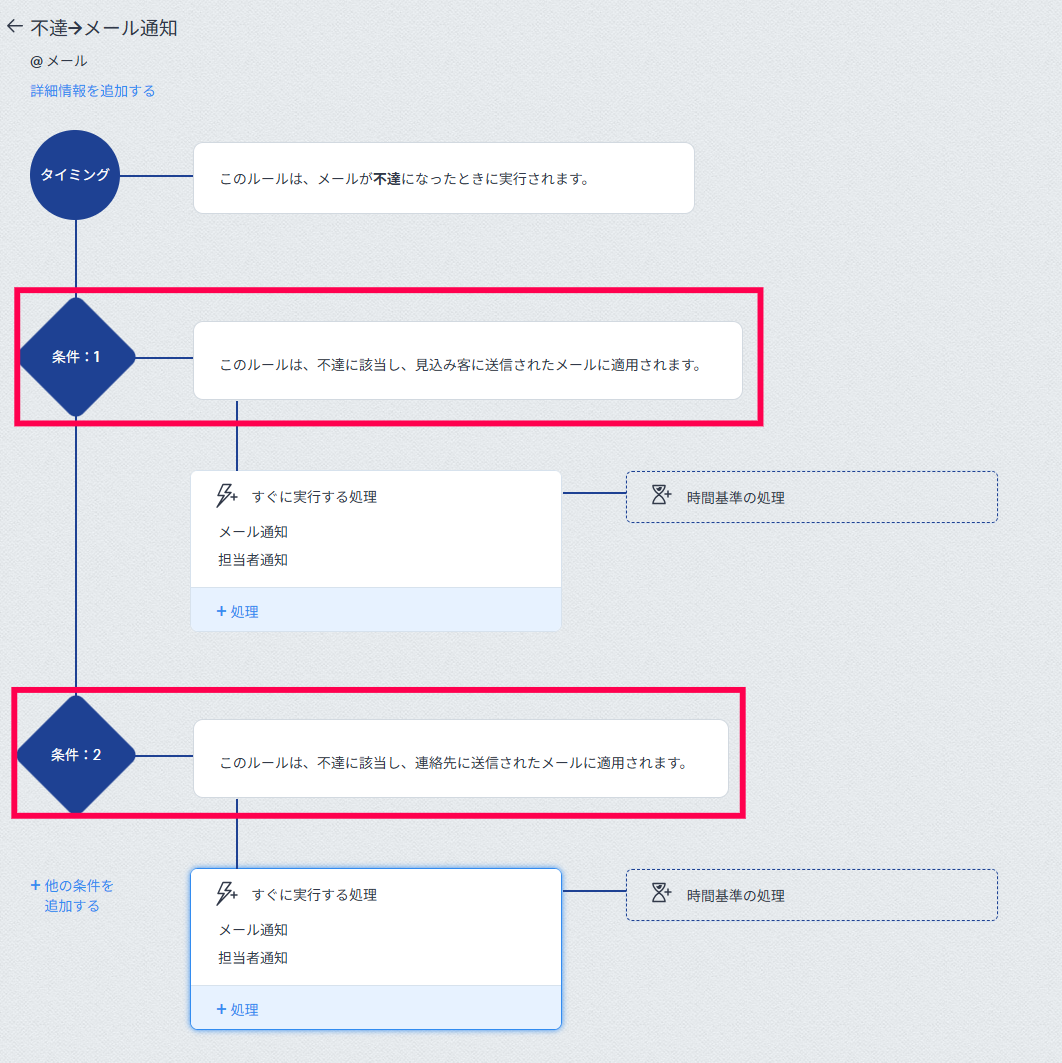 その後、必要に応じてワークフローの実行条件を設定し、「すぐ実行する処理」としてメール通知処理を設定することで、メールの不達が発生した際に、メールでの通知が可能です。