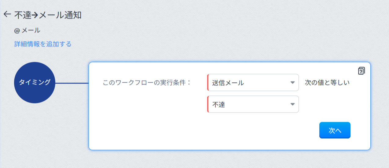ワークフローで不達が発生した際にメール通知を設定する場合には、メール送信を行うタブごとにワークフローの実行条件を設定する必要があります。