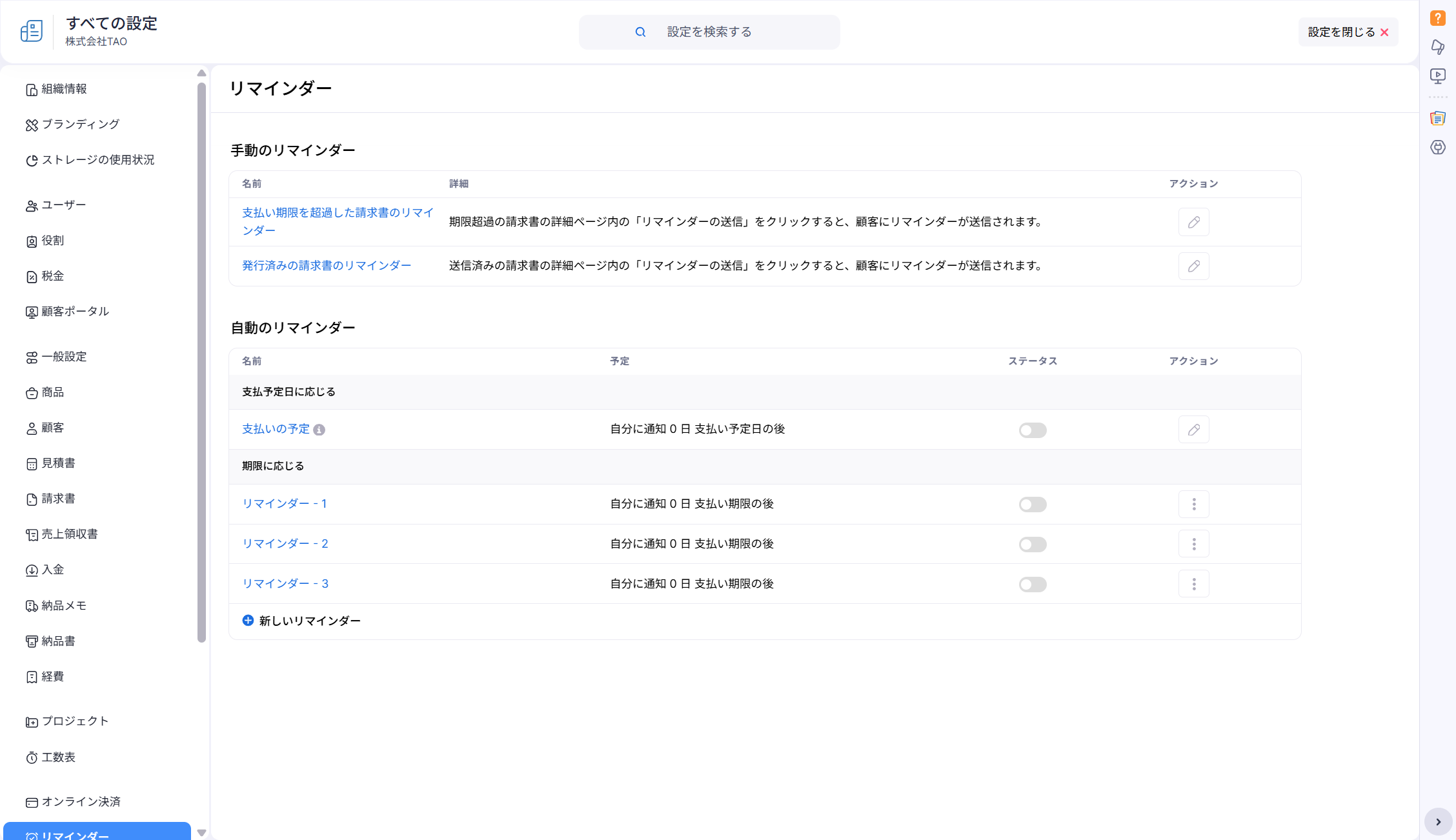 設定>リマインダー画面にて、リマインダーの編集、有効化/無効化、新規リマインダーの追加が可能です。