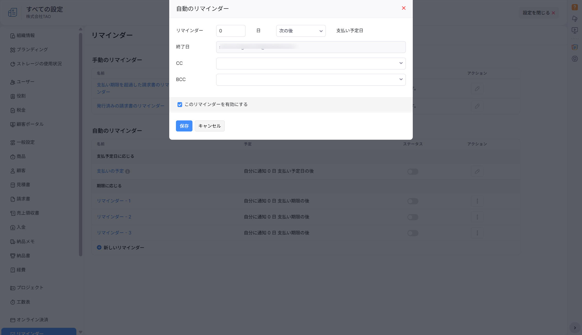 リマインダーの有効化を有効化する際には、「ステータス」のトグルをクリック後、「このリマインダーを有効にする」オプションを有効化し、「保存」ボタンをクリックします。