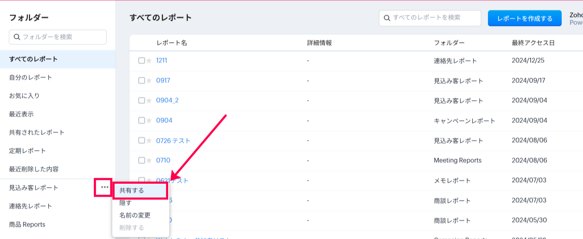 1)該当のレポートフォルダー横の「共有する」をクリック