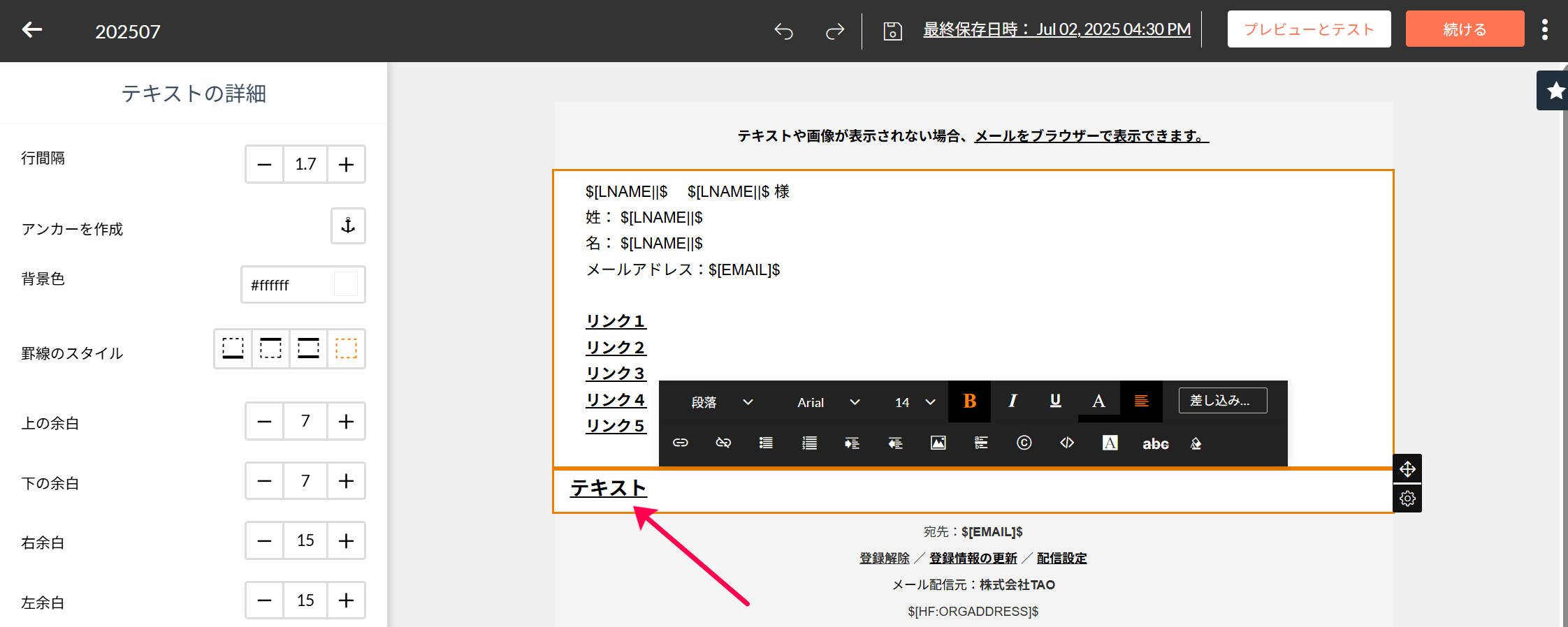 1)メールの本文編集画面へ移動し、リンクを設定するテキストを選択します