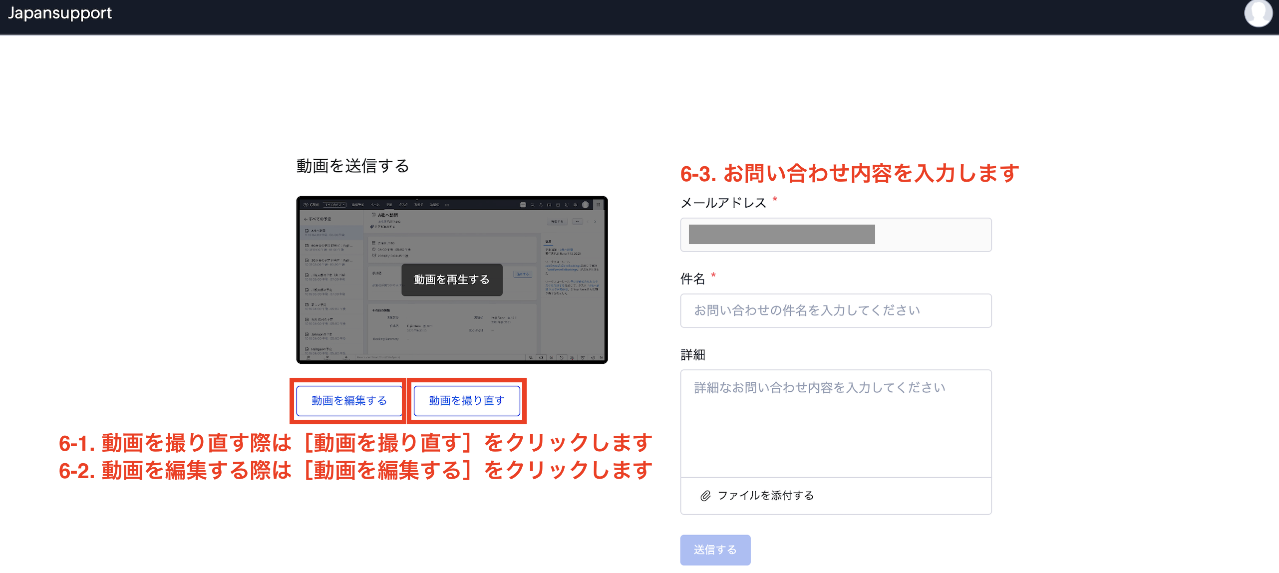 2. [動画を添付して問い合わせを送信する]画面で以下の通り操作します。