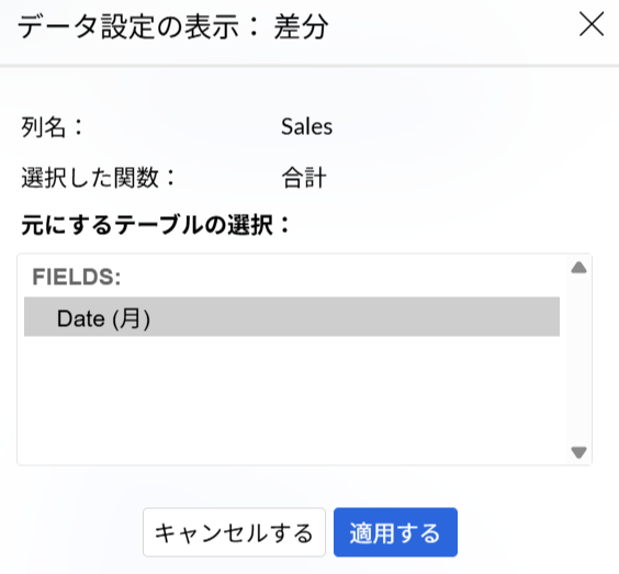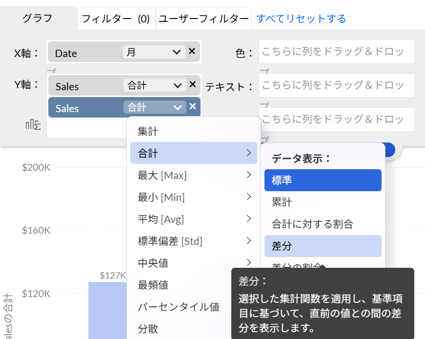 2)片方の項目にて、「集計」>「合計」>「データ表示:」から「差分」を選択