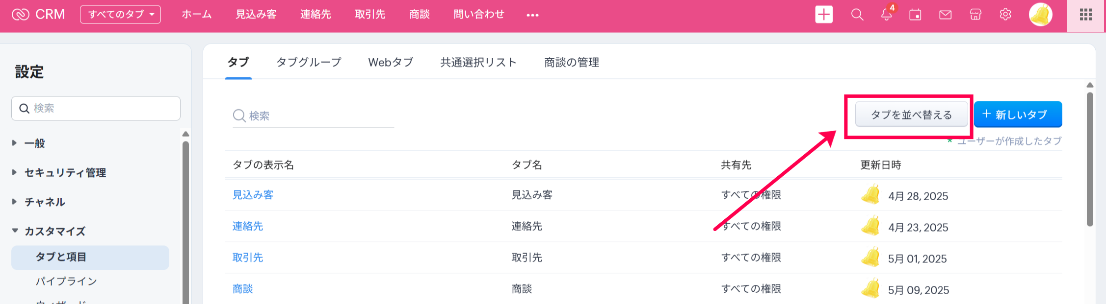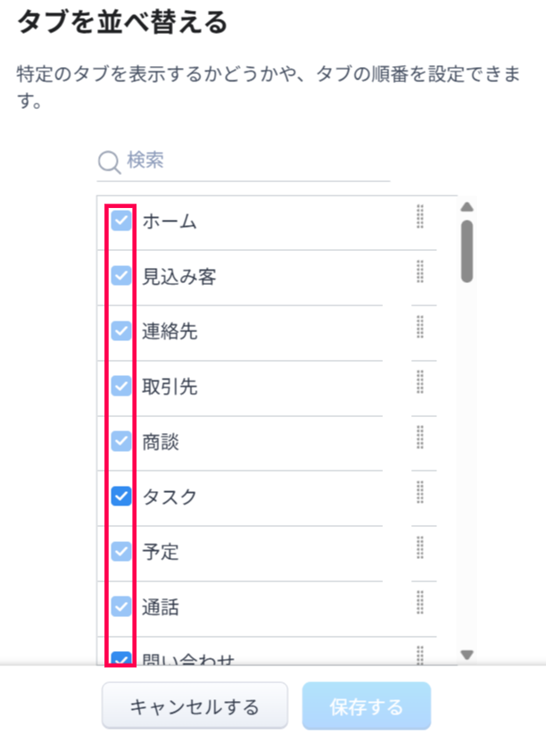 設定>カスタマイズ>タブと項目へ移動し、「タブを並び替える」ボタンをクリックすると、表示するタブや表示順の設定画面が表示されます。