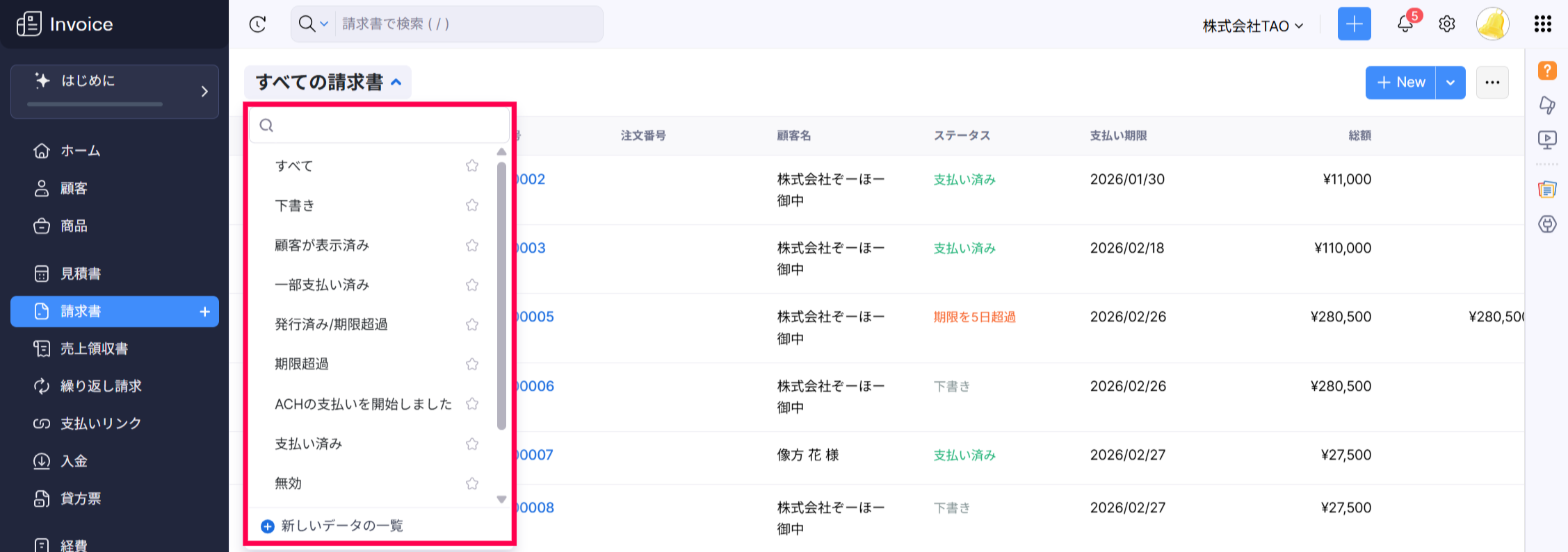 【Zoho Invoice】ステータス別に請求書を一覧表示する方法