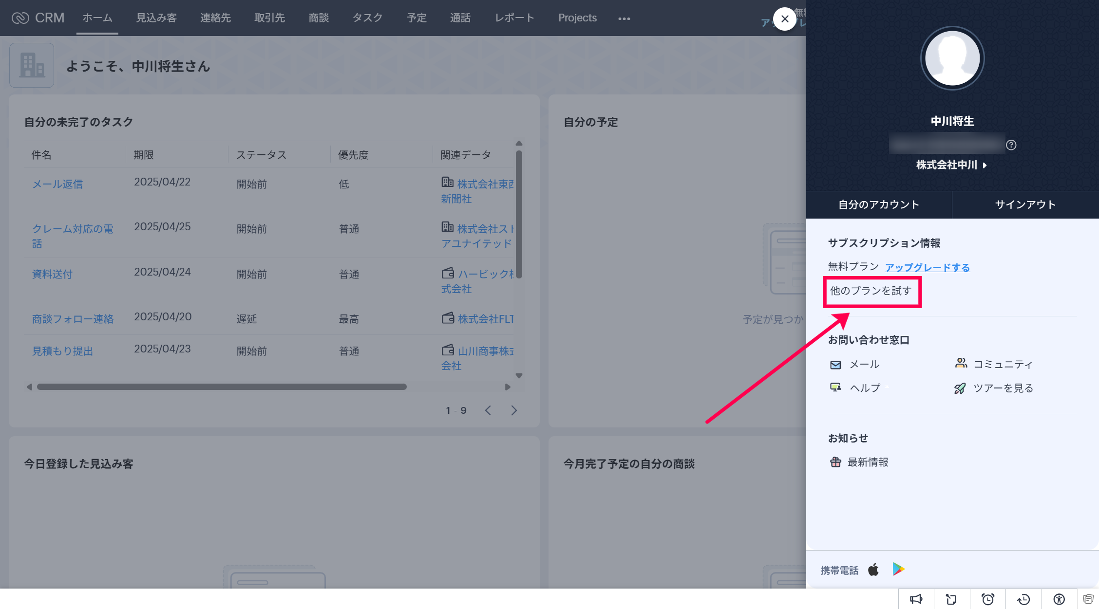 - CRM画面右上のプロフィールアイコンをクリックし、「他のプランを試す」をクリック