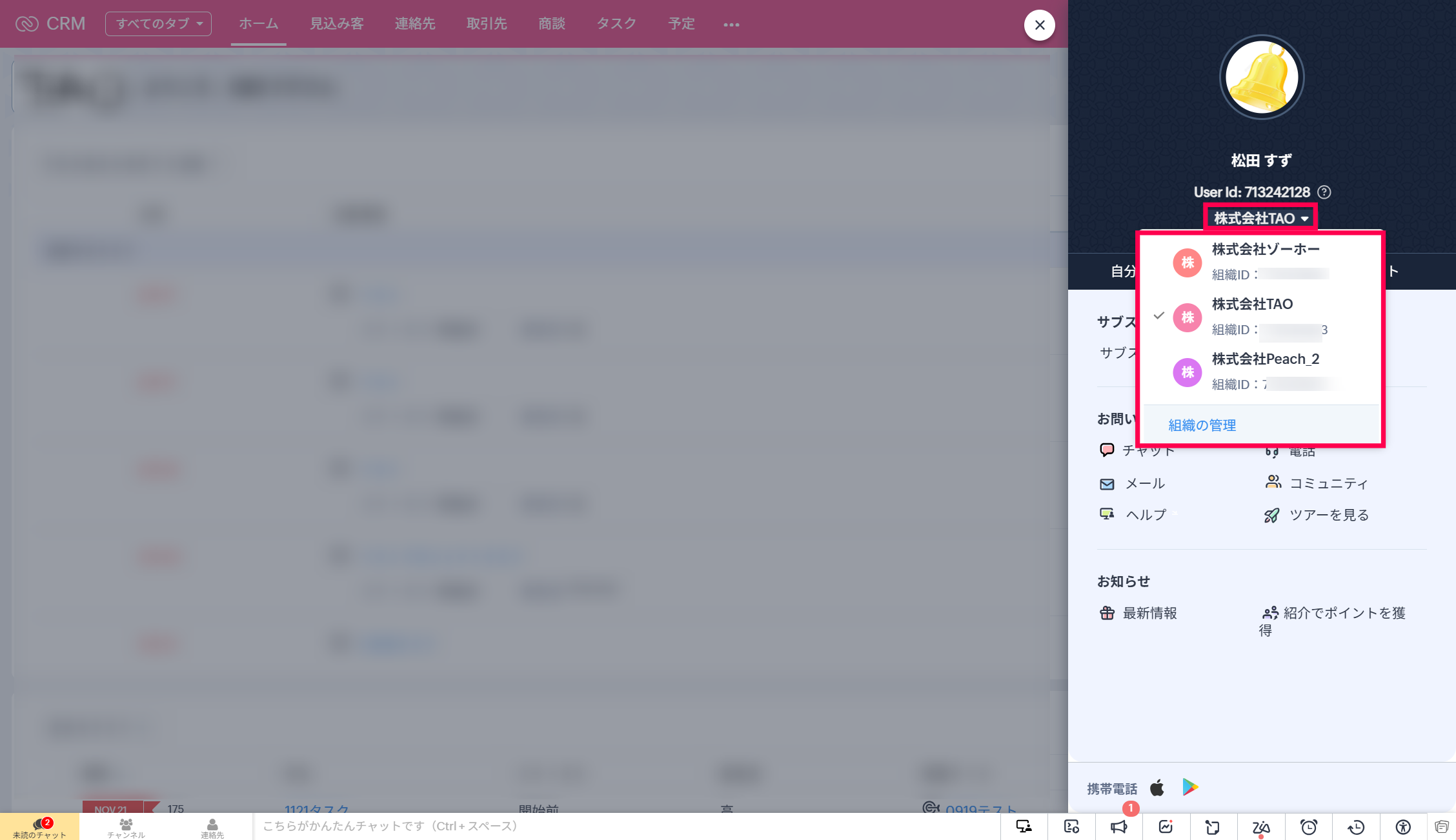 【Zoho CRM】複数のCRM組織に所属している場合の組織の表示切り替え方法