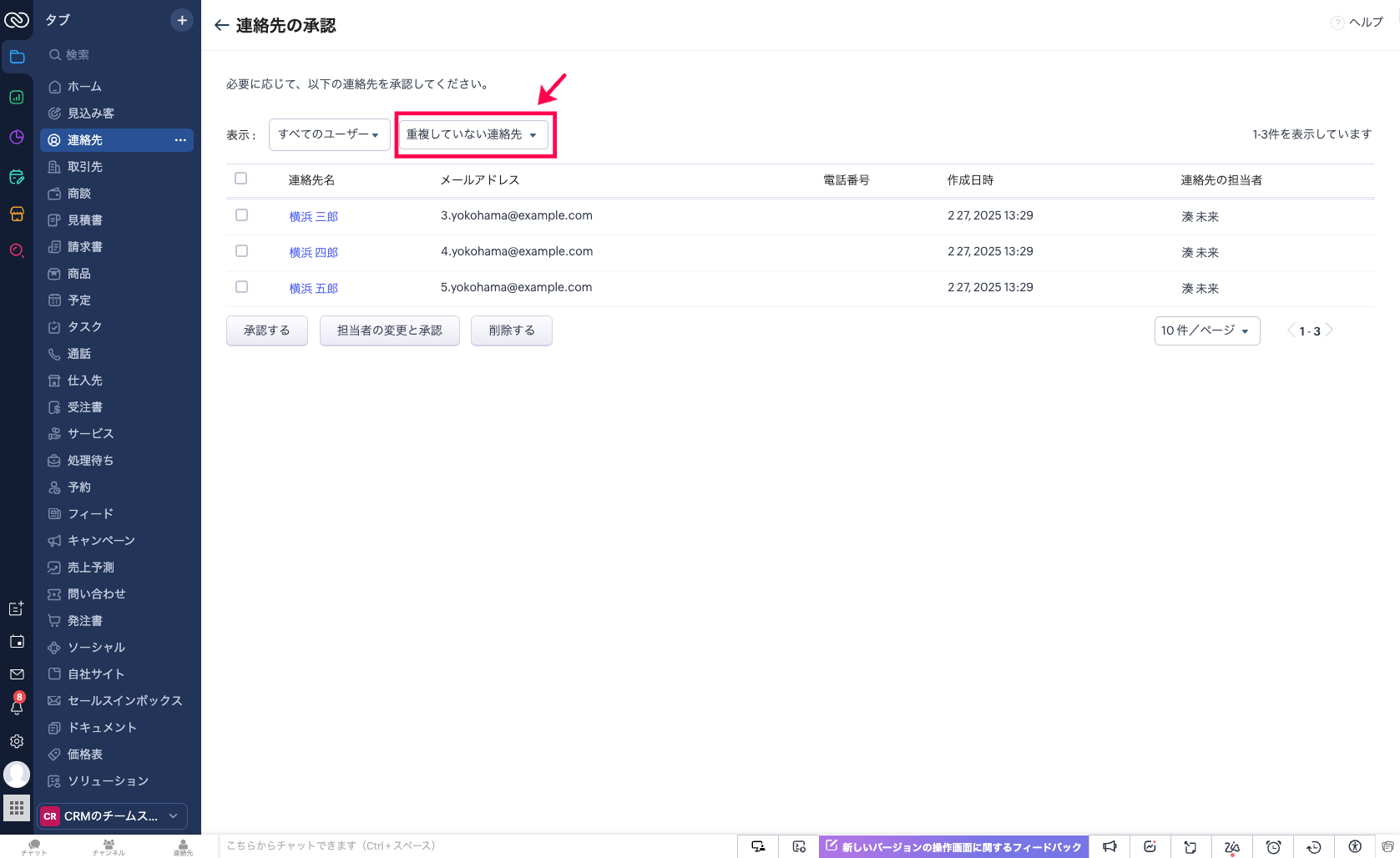 インポート成功メールの受信、またはインポート履歴で完了が確認できているにも関わらず、インポートデータがCRMのデータ一覧画面上に表示されない場合、データは承認待ちの段階である可能性がございます。