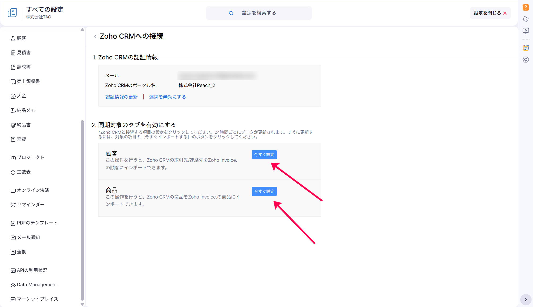 「2.同期対象のタブを有効にする」セクション内の「今すぐ設定」ボタンから、CRMと同期する対象のタブを設定します。