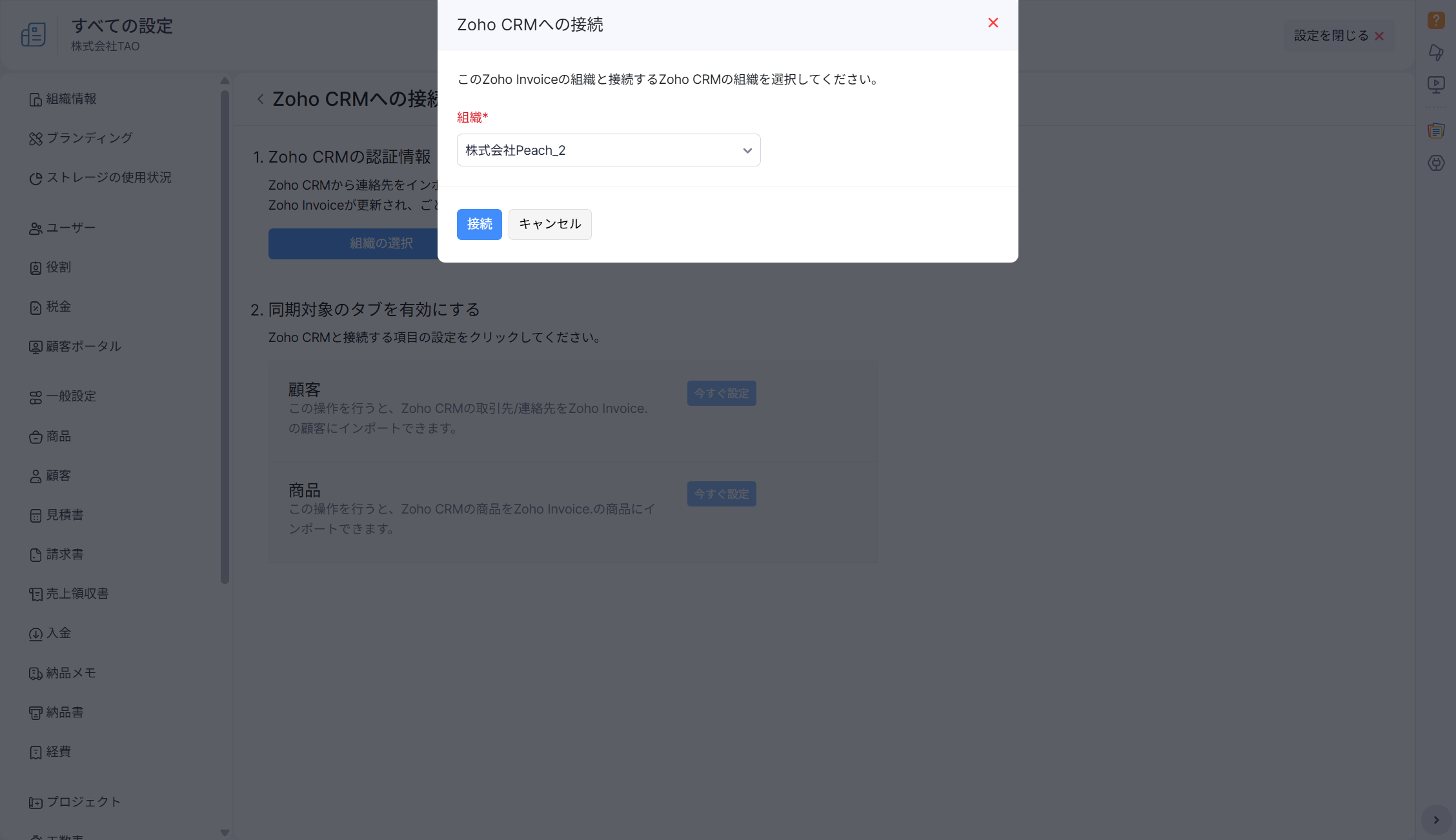 「1.Zoho CRMの認証情報」セクション内にある「組織の選択」ボタンをクリック後、連携を行うZoho CRM組織を選択して「接続」ボタンをクリックします。
