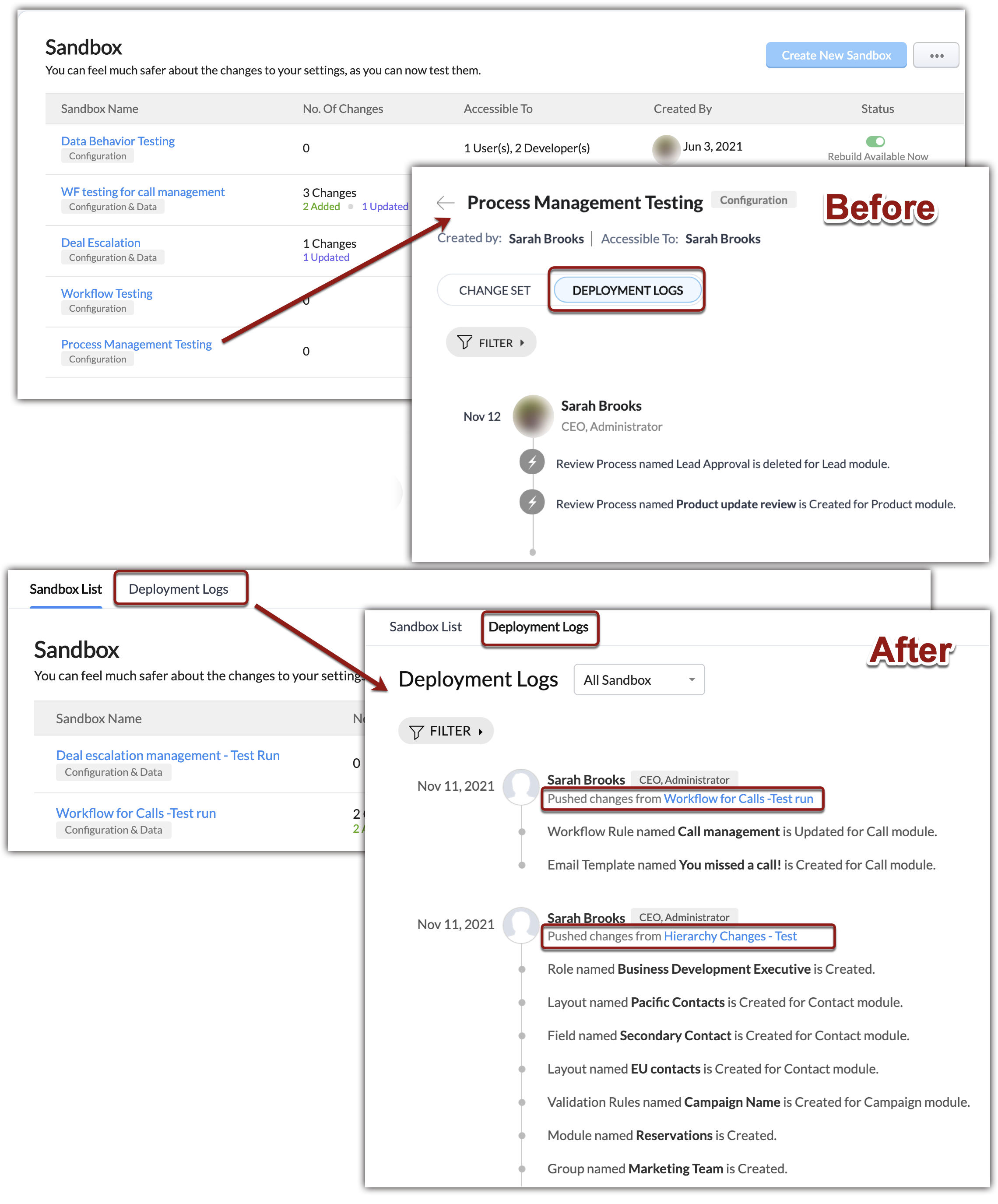 様々なビジネスケースをテストし、元のCRM設定を妨げることなく本番環境に適用することができます。これらの適用された情報は、適用ログに記録され、適用日、適用された変更名、適用したユーザーなどの詳細が時系列で表示されます。