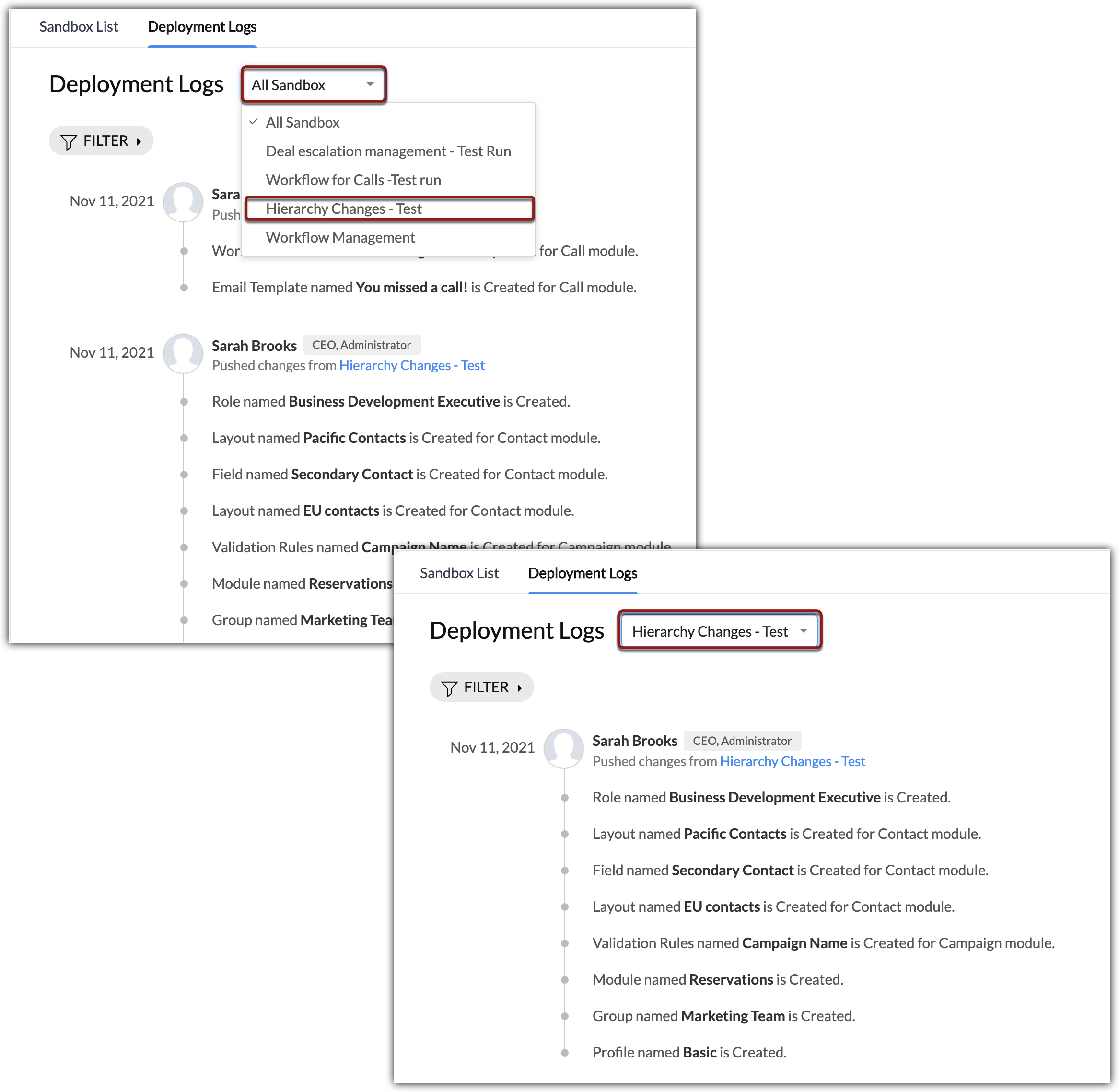 サンドボックスの管理権限を持つユーザーは、すべてのサンドボックスの適用ログを表示できます。