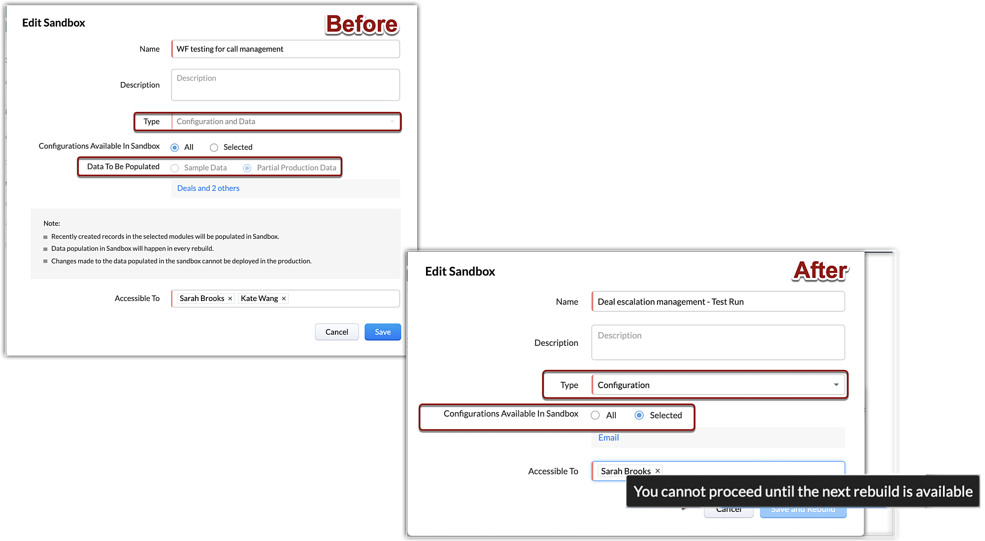 サンドボックスを編集できるのは、再構築オプションが利用可能になってからで、それまでは、サンドボックスの種類やサンドボックス内の設定などの項目は、編集できない理由を示す情報がないまま、編集できないようにロックされていました。