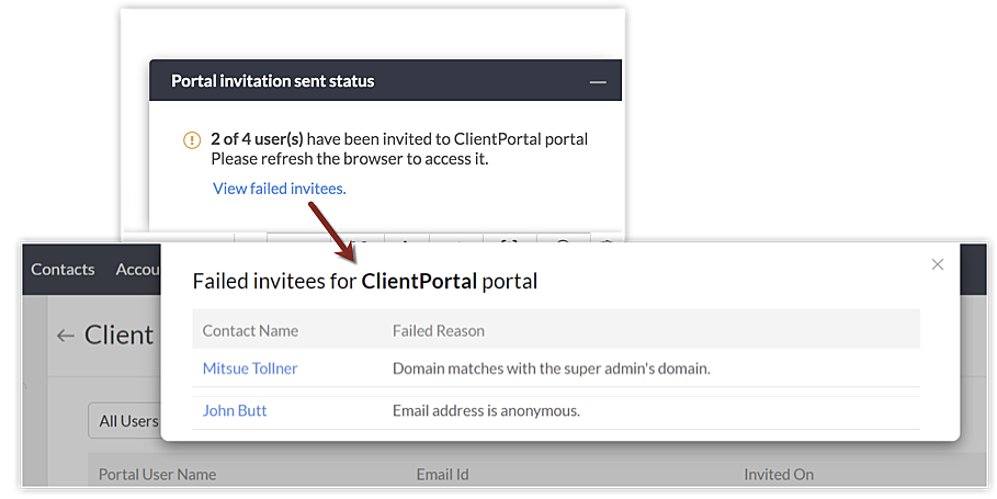 ポータルへの招待がユーザーに送信されないままになってしまう理由はいくつかあります。招待が送信されると、CRMアカウントにメッセージが表示され、成功した招待数と失敗した招待数が表示されます。