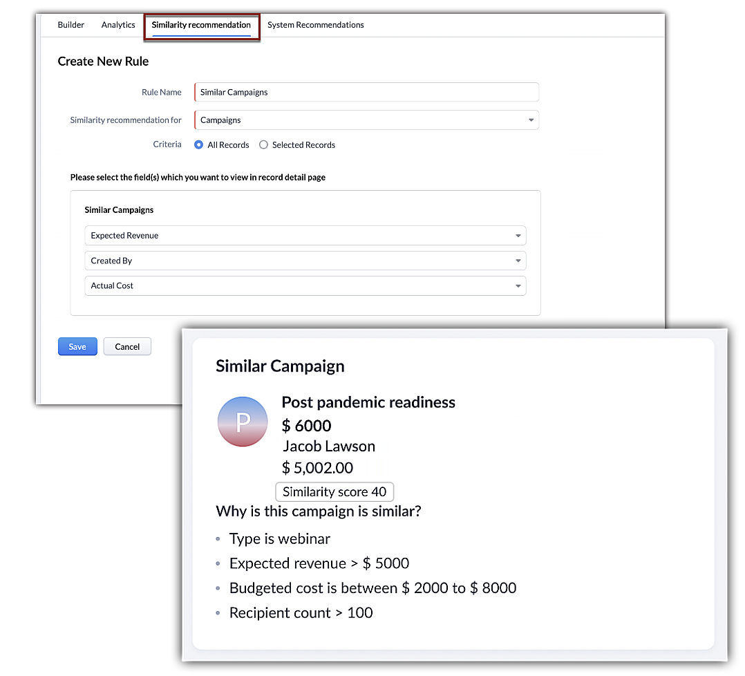 この機能は、Ziaがデータの類似パターン/特徴を識別し、現在のデータの手がかりとして表示するもので、CRMデータベース内の重複データを識別するためのものではございません。
