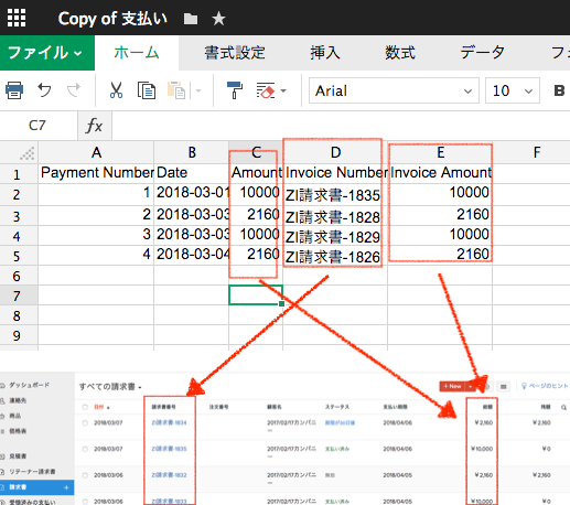 「支払い番号」「日付」「会計」「請求書番号」「請求総額」