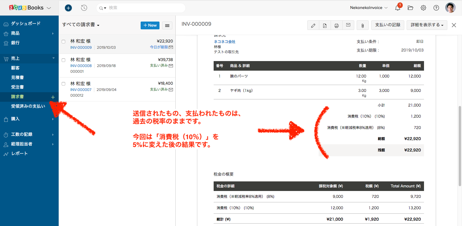 【Zoho Invoice】 税率の変更後は前のデータに影響しますか?