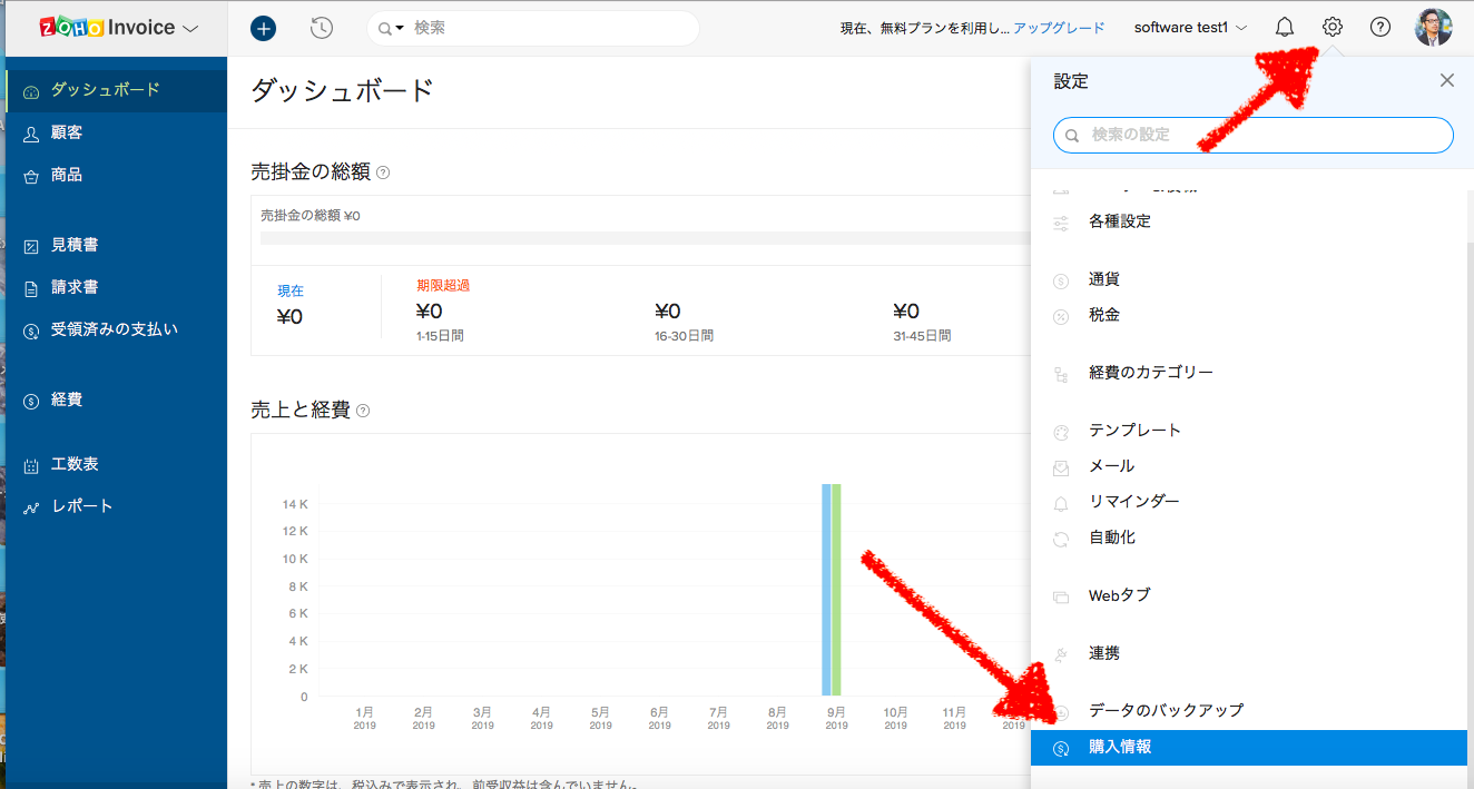 右上歯車「設定」アイコンをクリック、「購入情報」をクリックします。