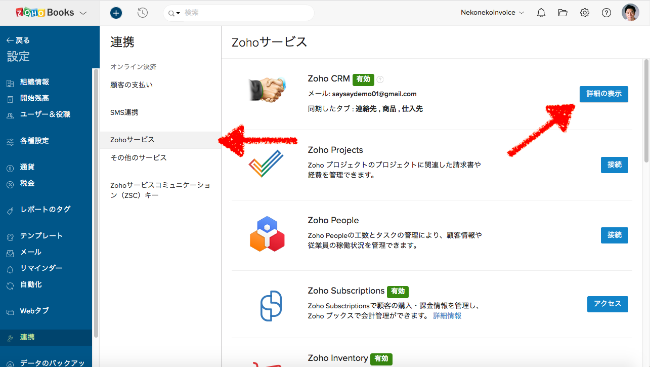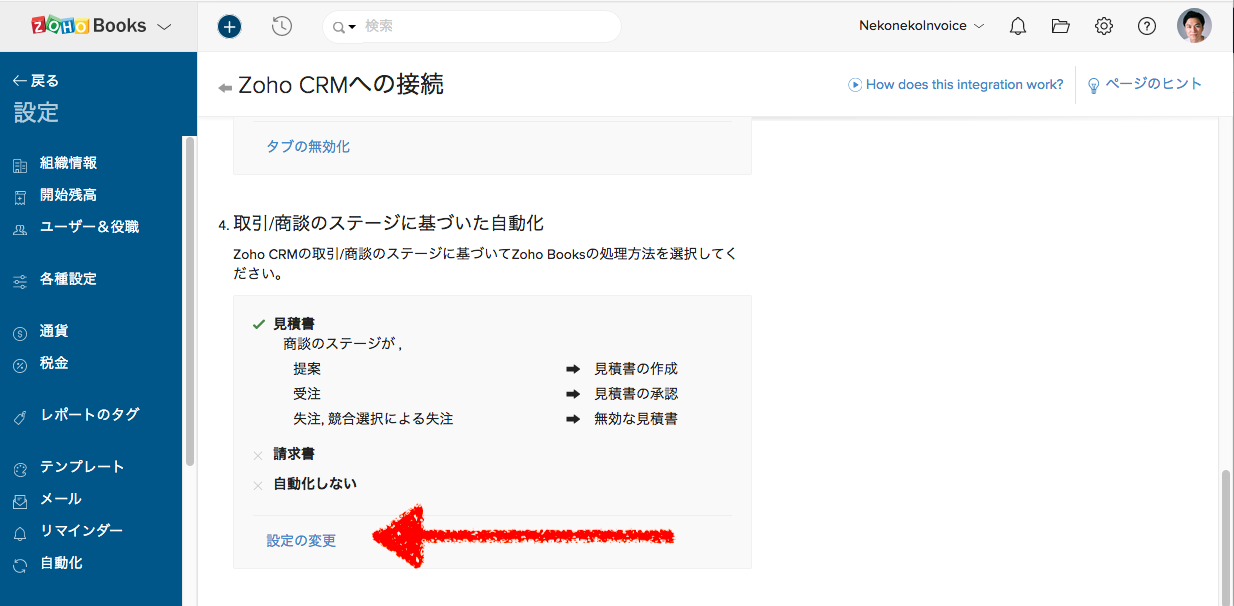 CRM商談の受注/失中とInvoice請求書の作成/無効の連動 「設定」アイコンをクリック 「連携」をクリックします。 「Zohoサービス」をクリックします。 Zoho CRMの「詳細の表示」をクリックします。 下に行きますと「取引/商談のステージに基づいた自動化 」 が表示されるので設定をクリックします。 どのステージでどのアクションを行えるかを選択して、 「保存」をクリックします。