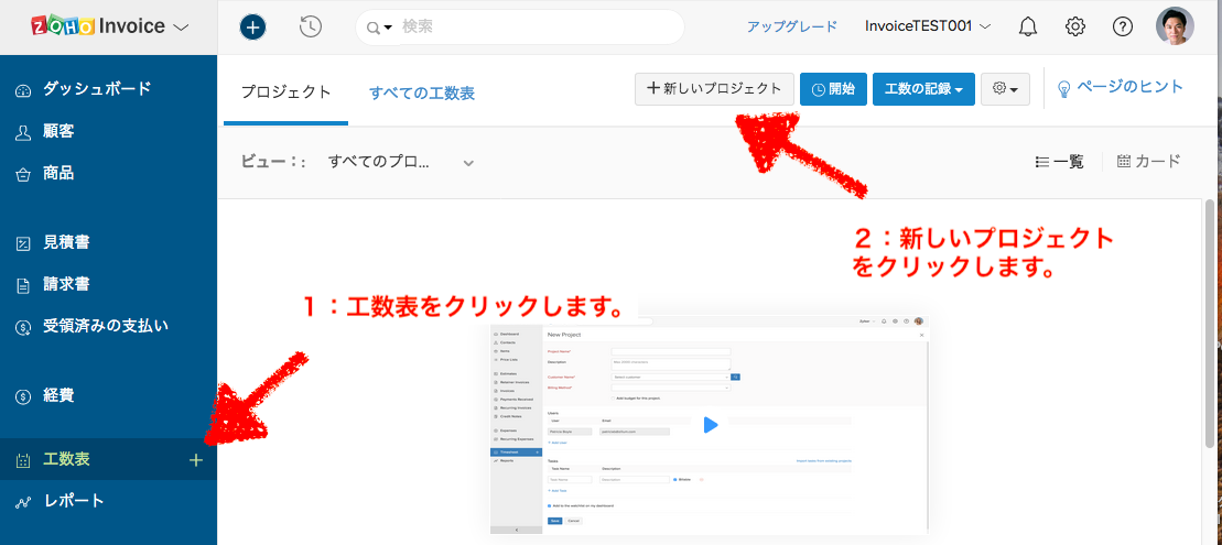 左タブの「工数表」→「新しいプロジェクト」をクリックします。