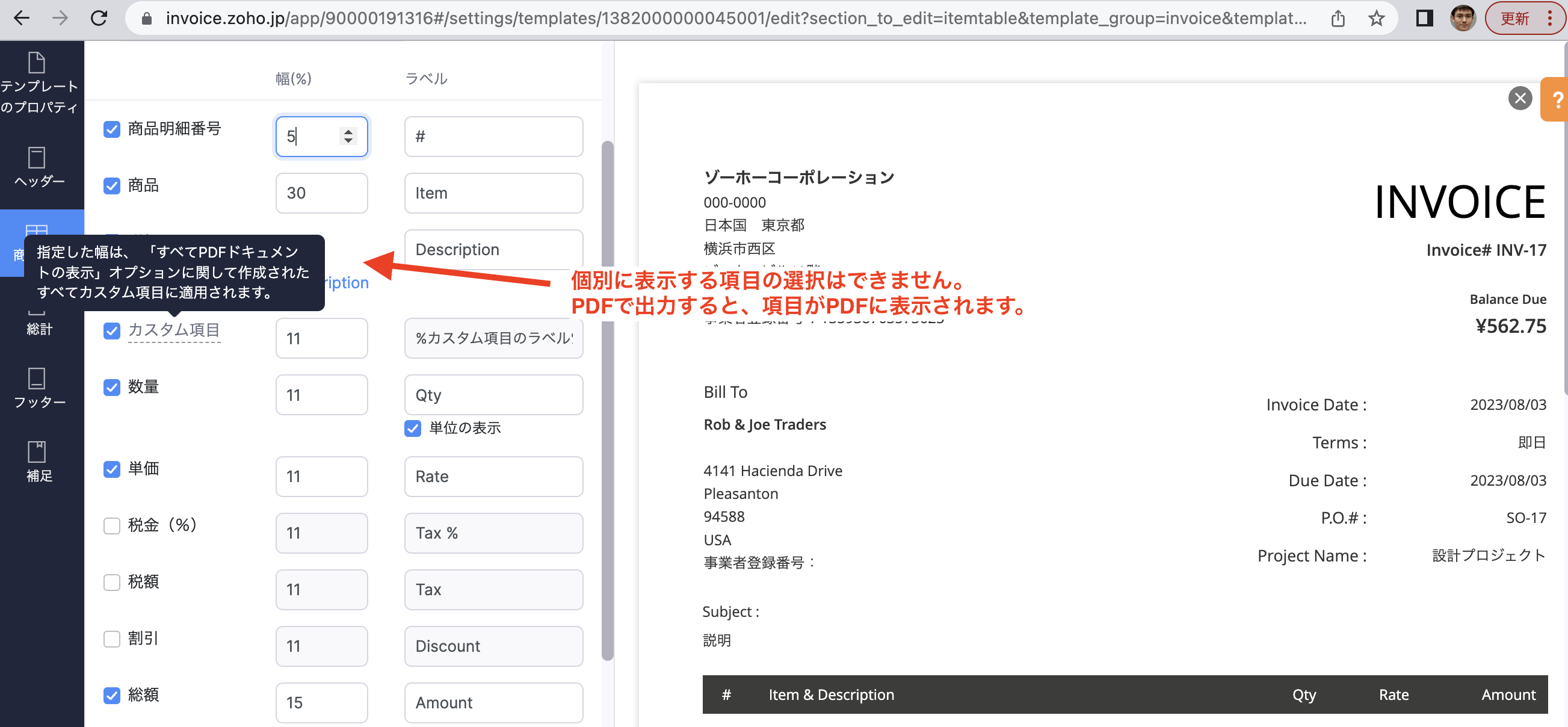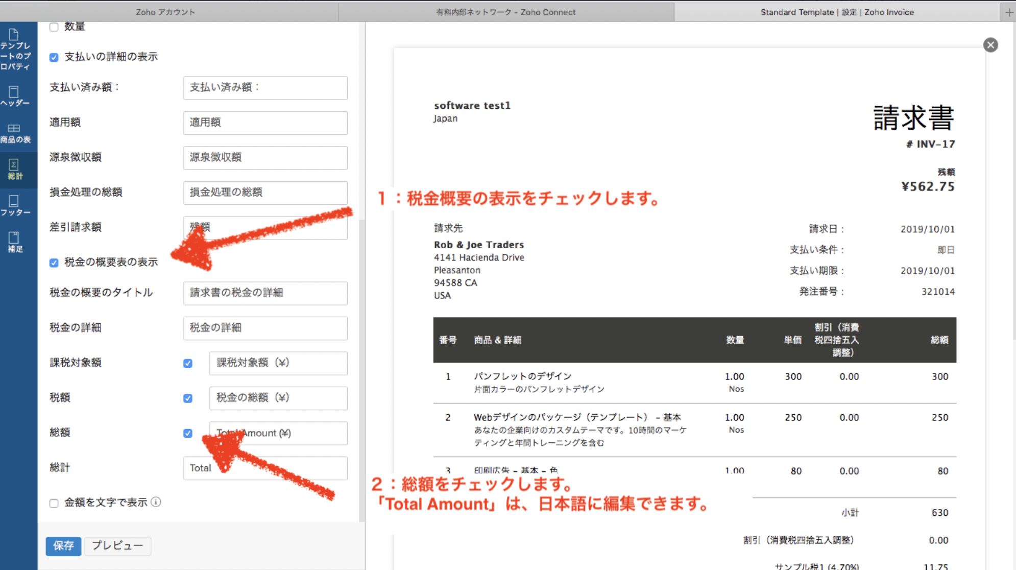 例えば、請求書のテンプレートで、「税金の概要の表示」→「総額」をチェックしますと、税金別の商品の総額をリストアップできます。