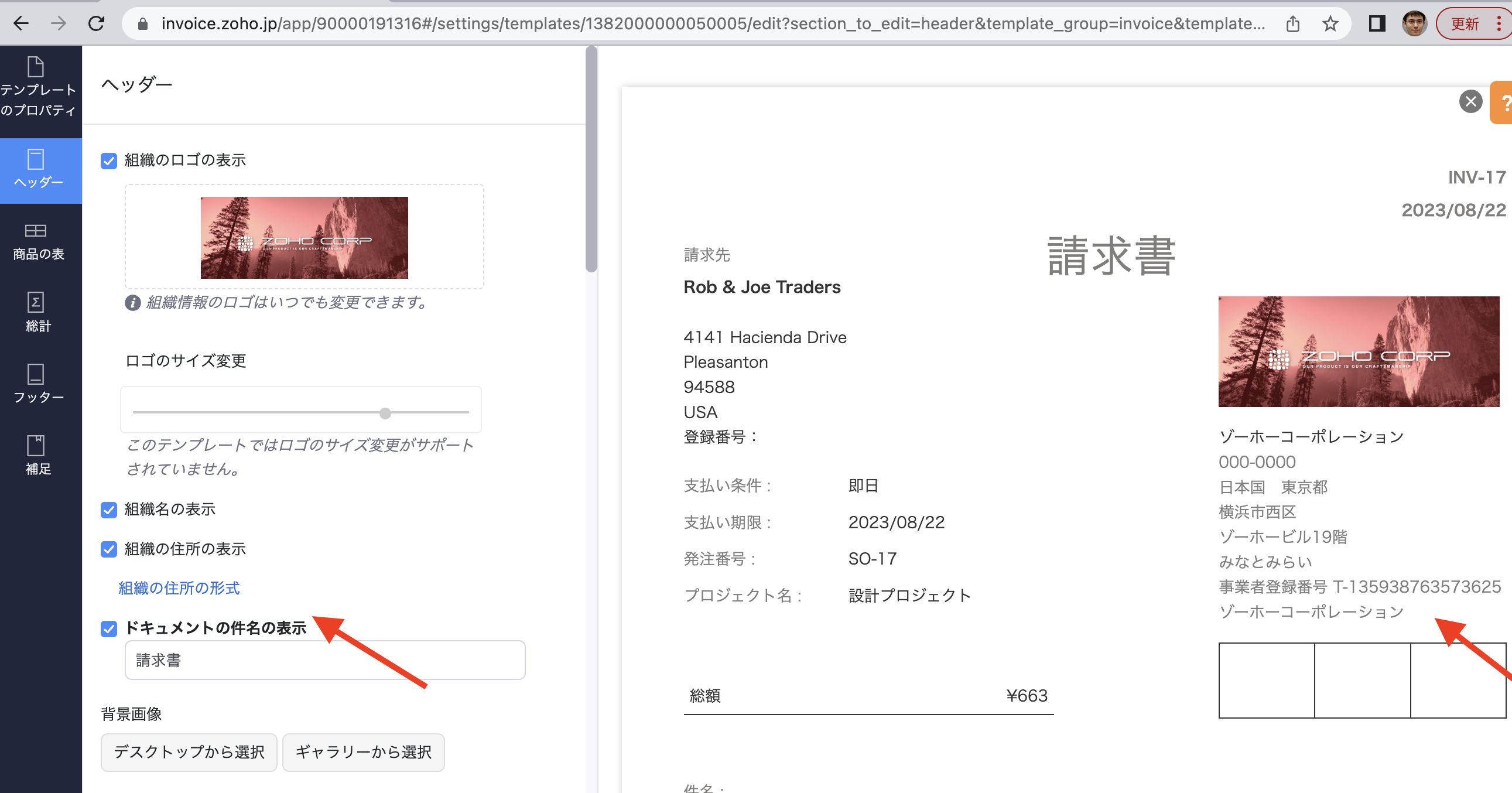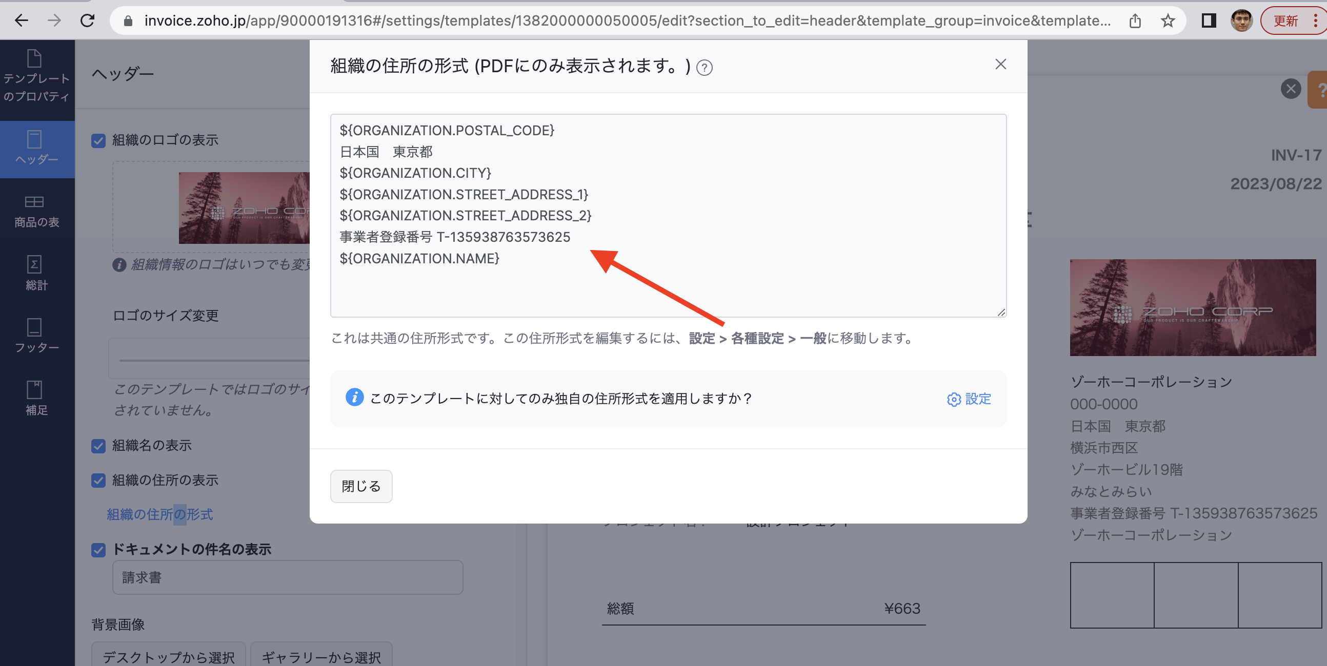 それぞれのテンプレートで自動で住所の下に登録番号が表示されます。