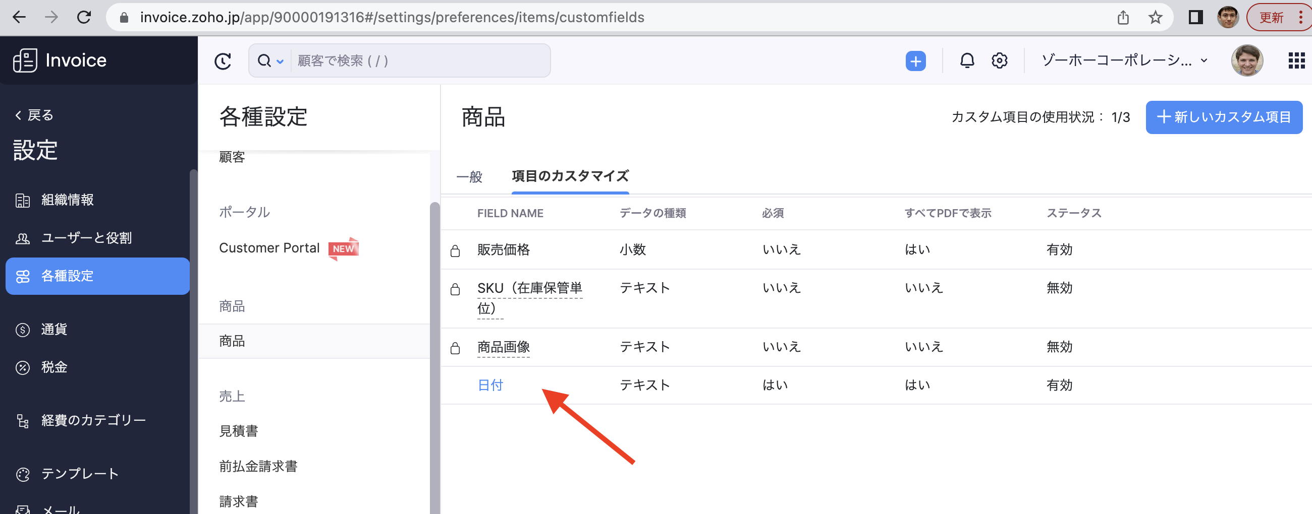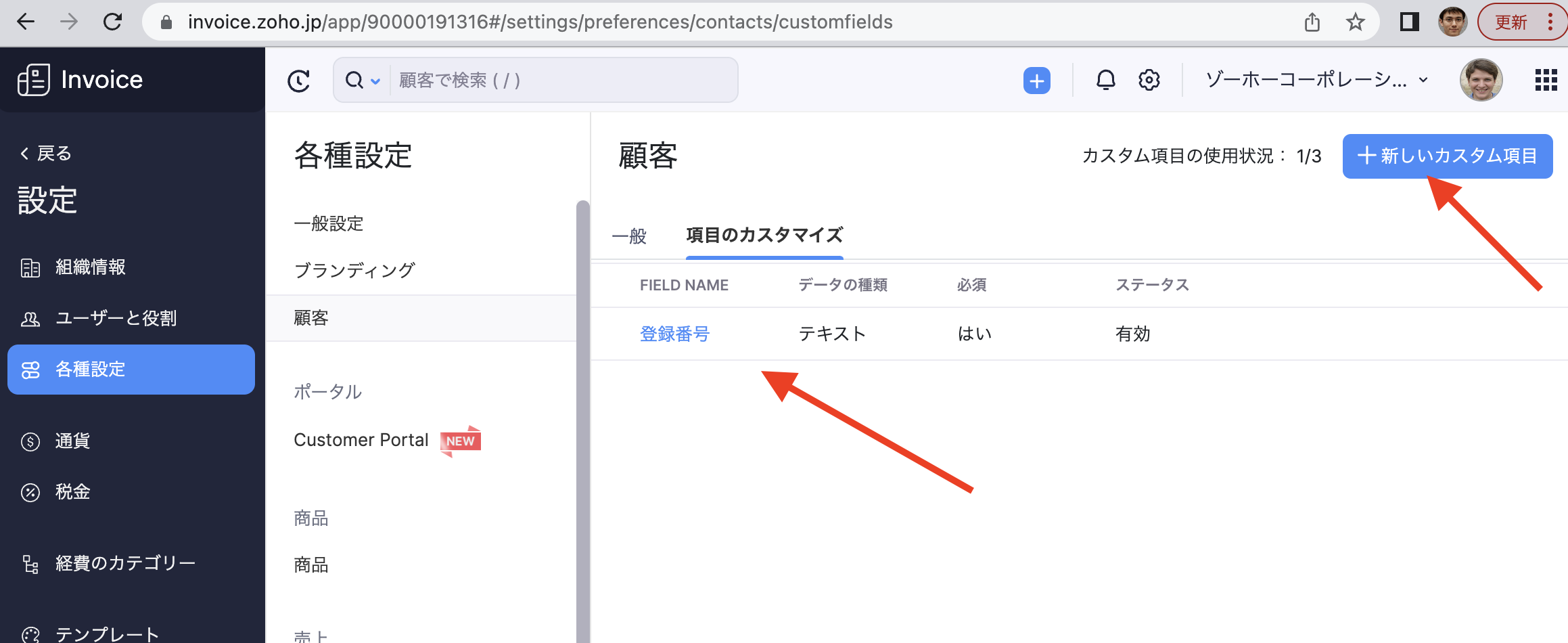 設定>各種設定>顧客>項目のカスタマイズ>+新しいカスタム項目