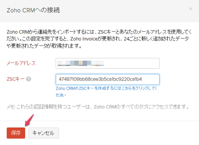 「Zoho CRMへの接続」のポップアップページに戻り、コピーしたZSCキーを貼り付け、「保存」をクリックします。