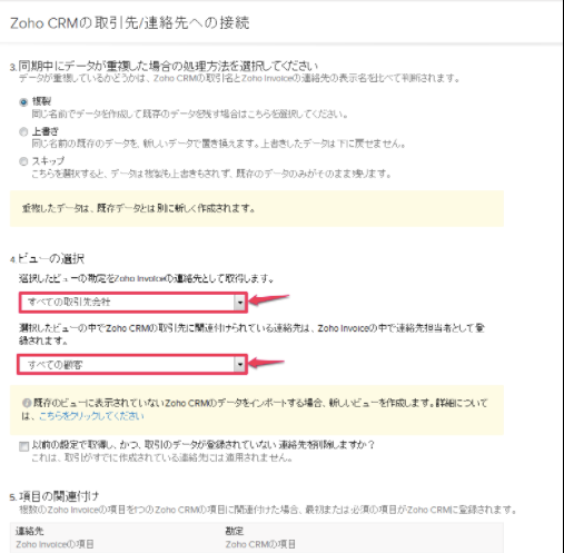 「5.項目の関連付け」で、Zoho インボイスの項目とZoho CRMの項目を関連付けます。