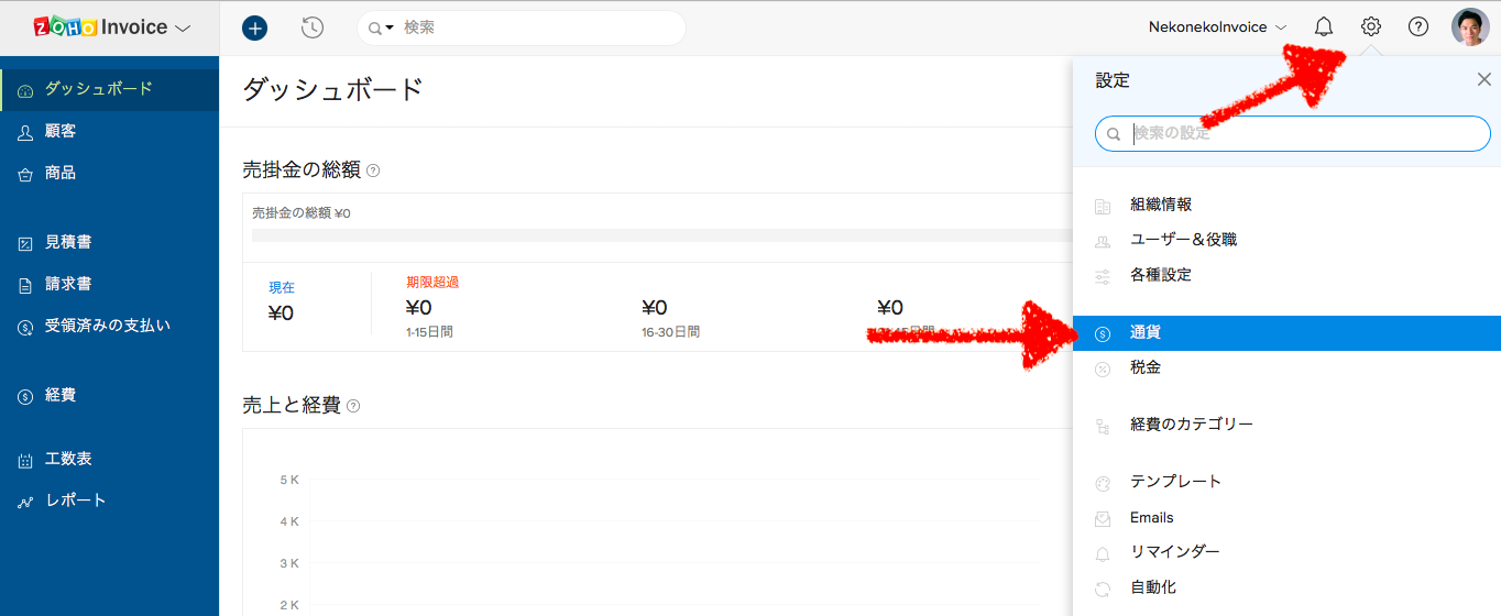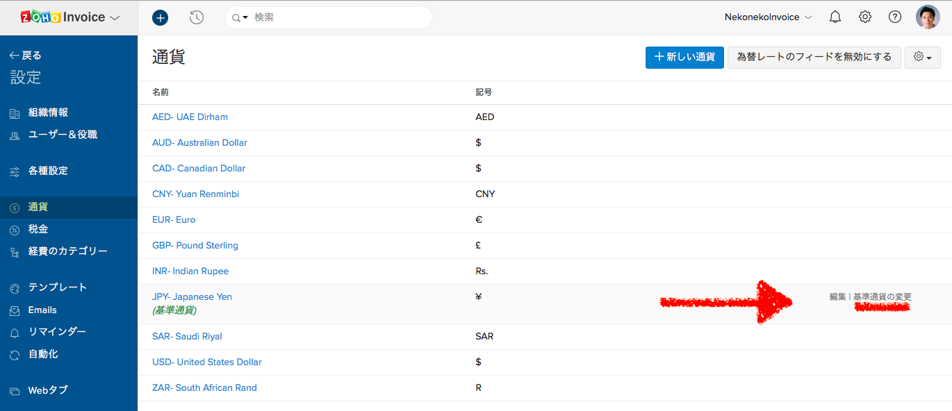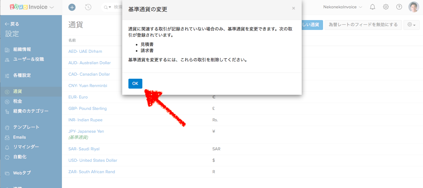 【Zoho Invoice】 基準通貨の設定(取引開始後変更不可)