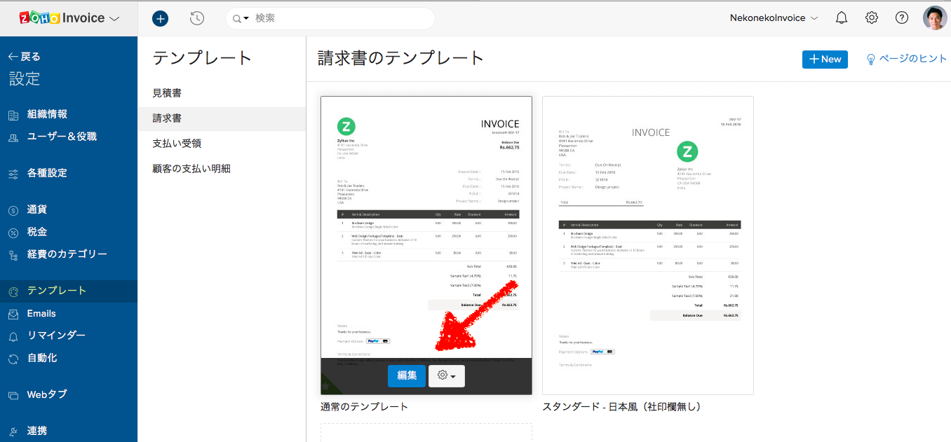 日本向けテンプレートを追加できます。 手順をご案内します。(6Step) 1)詳細設定画面へ 右上の設定ボタン(歯車マーク)をクリックして、「テンプレート」へ 2)テンプレート追加画面へ 請求書、見積書を選択して、「新しいテンプレート」から「New」ボタンをクリックします。 3)テンプレートの選択:スタンダード-日本向けのスタイル 追加したいテンプレートにカーソルをあて、「これを使用する」ボタンをクリックします。 日本向けのテンプレートは2種類です。 ...