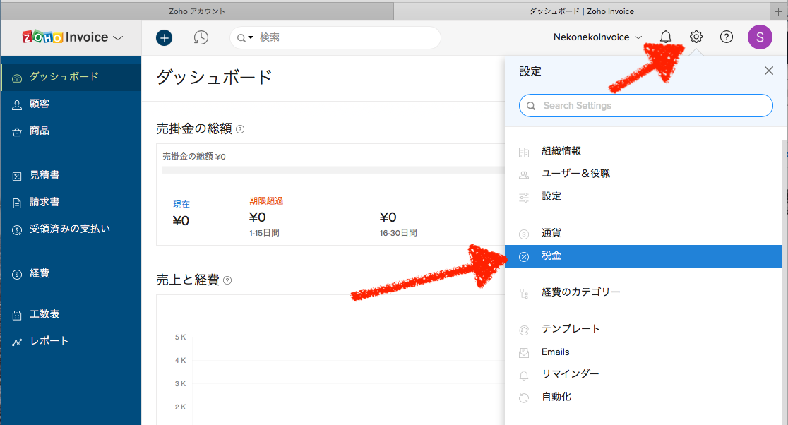 ・画面の右上隅にある歯車のアイコンをクリックして、ドロップダウンから税金をクリックします。
