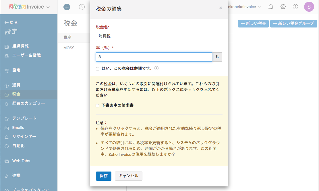 【Zoho Invoice】 税率の変更後は前のデータに影響しますか?