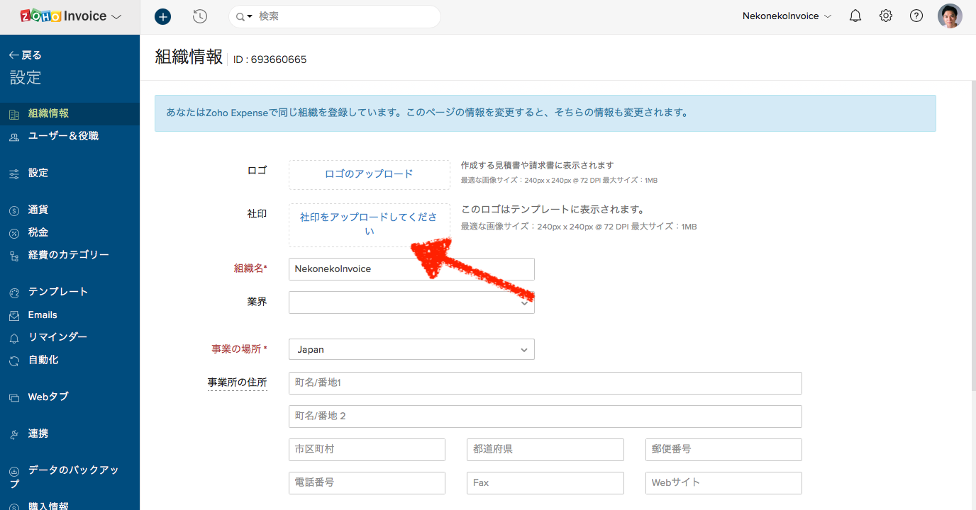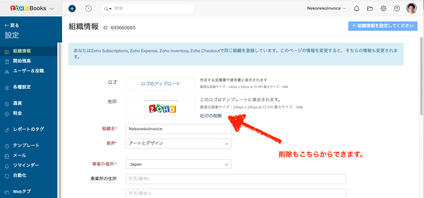【Zoho Invoice】 社印のアップロード/削除/反映