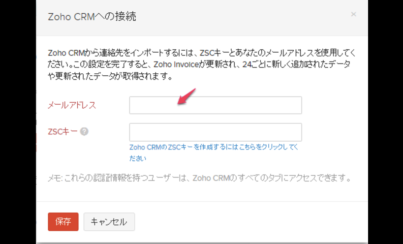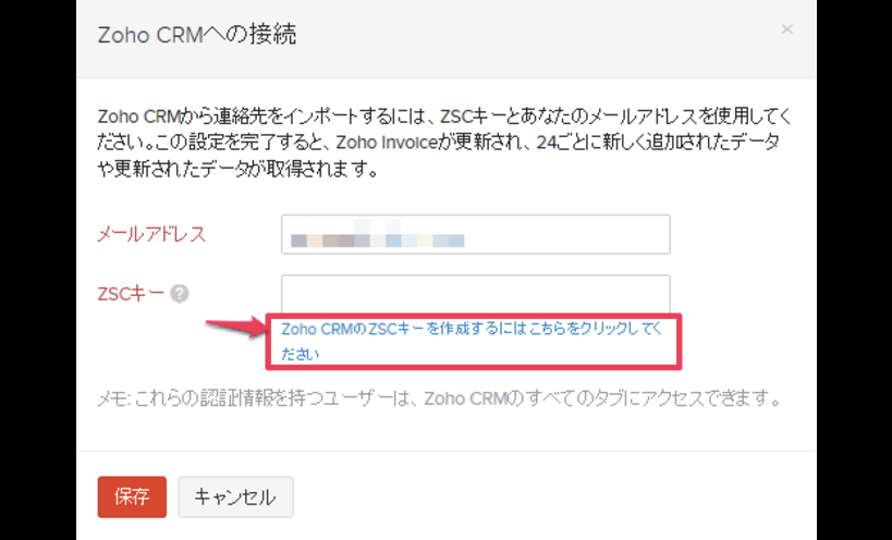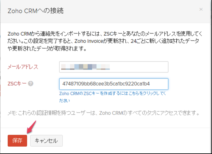 「Zoho CRMへの接続」のポップアップページに戻り、コピーしたZSCキーを貼り付け、「保存」をクリックします。