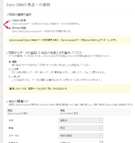 「1.同期の種類を選択」で「CRMから取得」か「双方向の同期」を選択します。