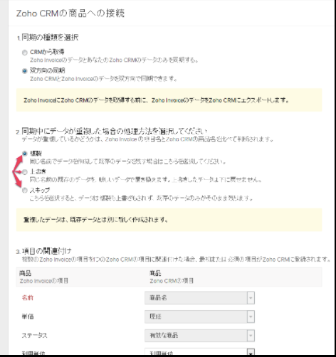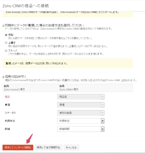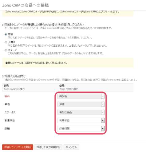 「3.項目の関連付け」で、Zoho インボイスの項目とZoho CRMの項目を関連付けます。