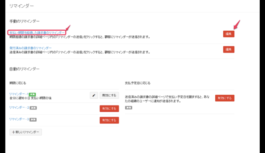 「支払い期限を超過した請求書のリマインダー」リンク、もしくは「編集」ボタンをクリックします。