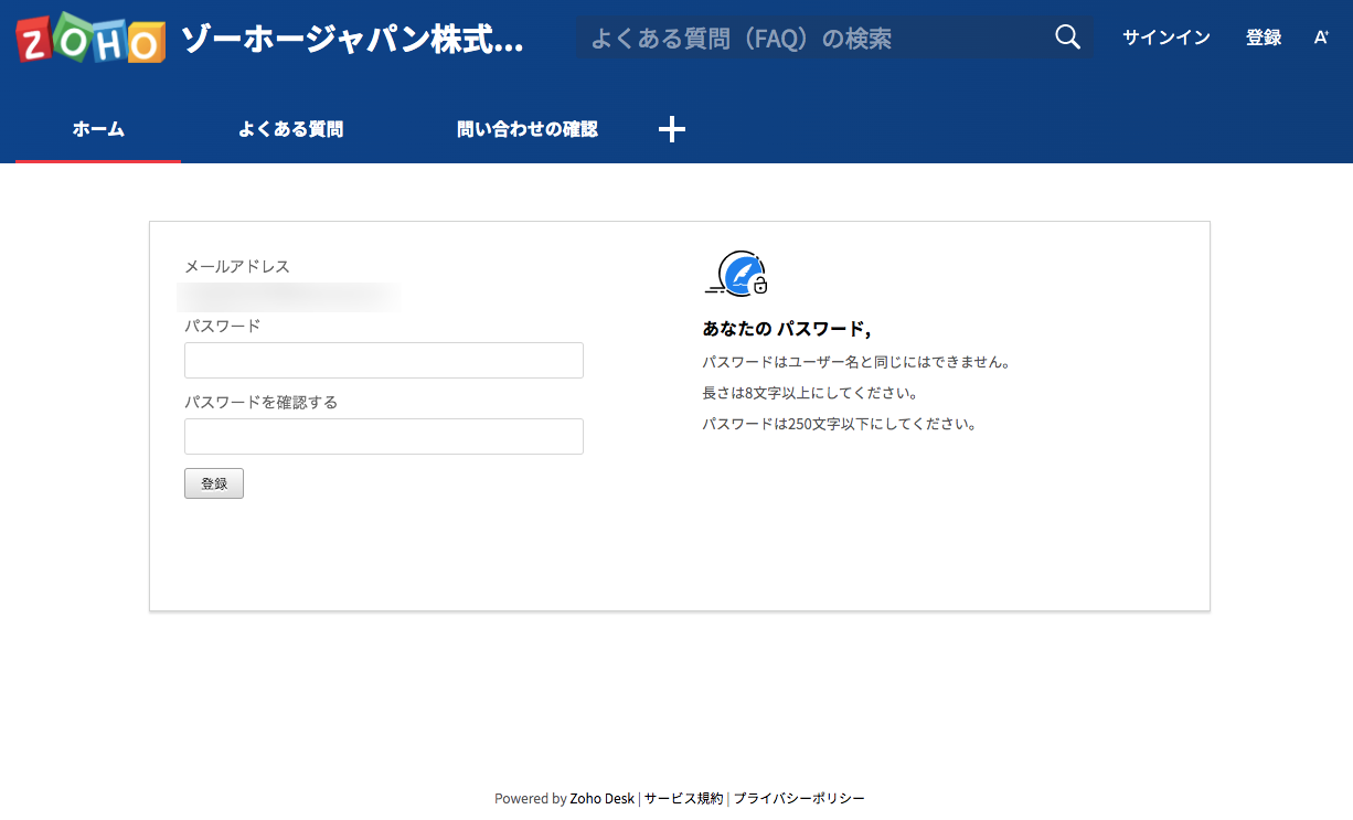 メールアドレスの欄には、Zohoサービスに登録したメールアドレスを入力してください。