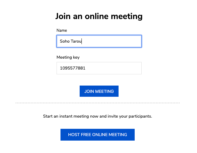 Meeting key欄は表示されたままの内容で変更は必要ありません。Meeting key欄に値が表示されていない場合は、リモートセッション用のURLの「key=」以降の数字を入力してください。